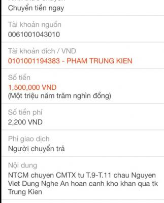 - [02/05/2019]:Trao quà CMTX tháng 4/2019 và tháng 5/2019 (do TV bận nên trao 2 tháng một lượt) 500,000đ + 500,000đ = 1,000,000đ.[Trungkienbeo@gmail.com]