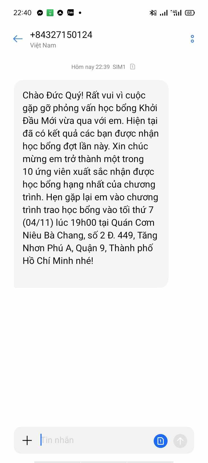 Con là Quý con trai lớn của mẹ Triều. Trong lúc học tập tại Sài Gòn, cháu có đăng ký phỏng vấn học bổng khởi đầu mới, và cháu là một trong 10 bạn ứng viên nhận học bổng của chương trình trị giá 18 triệu, mỗi tháng chuơng trình trợ cấp cho cháu số tiền 1,5 triệu. Cháu xin chân thành cảm ơn đã hỗ trợ cho cháu học bổng để cháu cố thêm chi phí để học tập cung như trang trải cuộc sống tại Sài Gòn ạ .