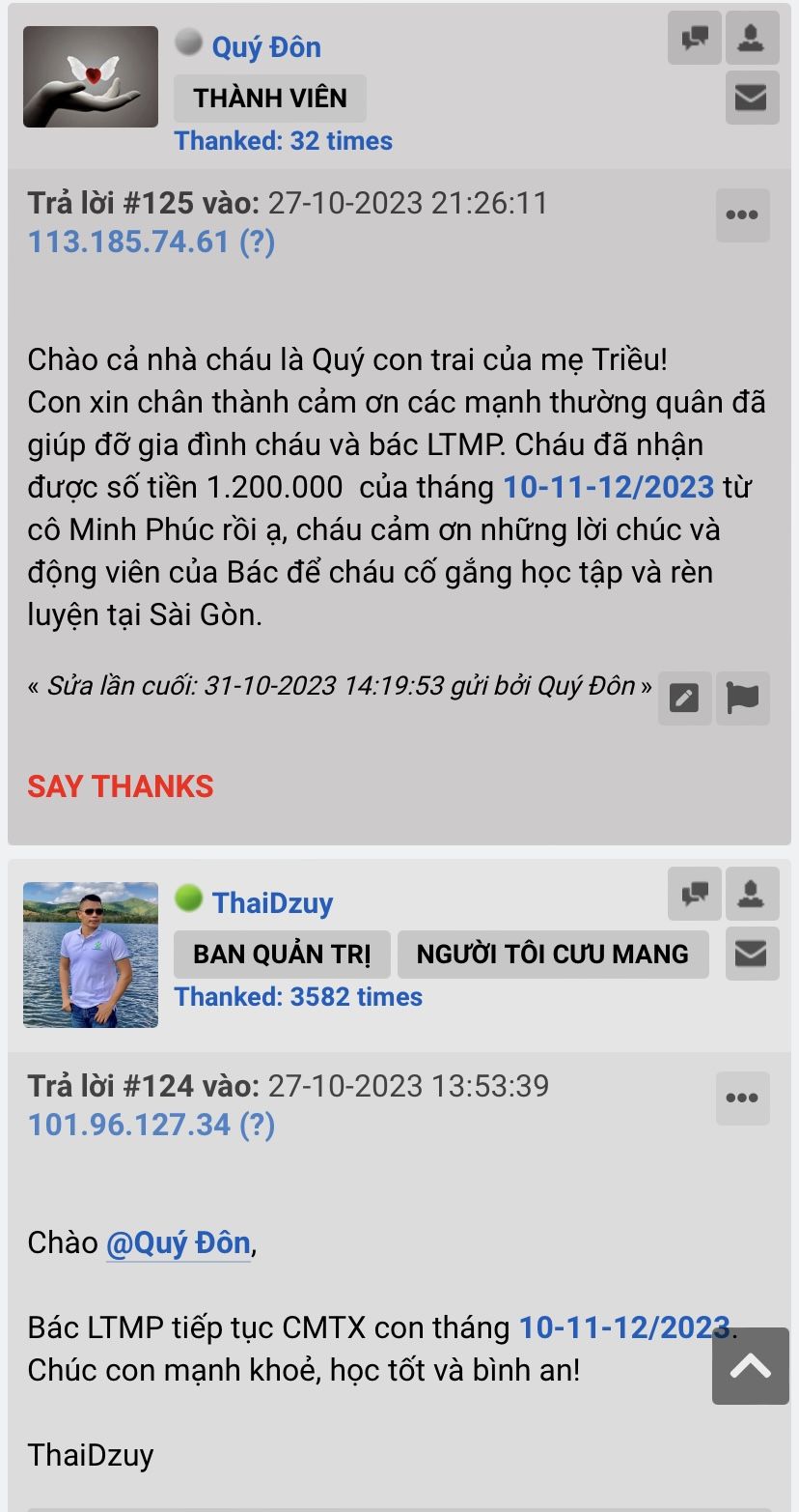 Hôm nay mông 1 tết cháu chúc cô Minh Phúc  năm mới bình an, gặp nhiều may mắn, an khang thịnh vượng, tấn tài tấn lộc. Cảm ơn cô Minh Phúc đã hỗ trợ gia đình cháu một tháng 400,000đ/tháng để gia đình cháu đỡ khó khăn hơn phần nào, cháu cũng cảm ơn bác @banbe6x , anh @letuantu   và quán cơm 2000đ đã giúp đỡ cháu trong thời gian học tập tại Sài Gòn. Chúc các cô chú, anh, chị, trong diễn đàn dồi dào sức khoẻ và gặt hái được nhiều thành công hơn nữa trong năm mới, chúc quán cơm 2000đ và diễn đàn tiếp tục phát triển để giúp đỡ các hoàn cảnh khó khăn trong xã hội.