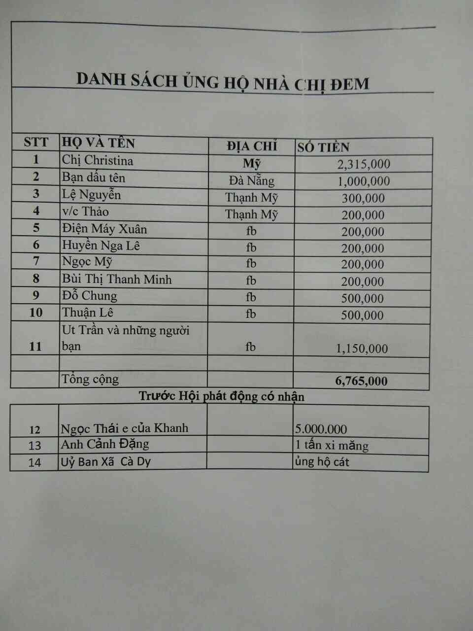 - Cô Mai ( TV Quán cơm 2000 SG) ủng hộ 500.000đ ( đã nhận tiền mặt)