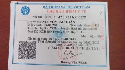 Cháu Nguyễn Bảo Toàn sing ngày 24/1/2011 là con của chị Nguyễn Thị Vinh Xóm 11 Thôn Tây Sơn Xã Thạch Đỉnh . Chị Nguyễn Thị Vinh cũng giống như bao cô gái khác đến tuổi đi lấy chồng rồi mang thai tin vui chưa hết tin giữ ập đến với gia đình chị , chị bị bệnh hiểm nghèo phải cưa một chân và chồng cũng bỏ đi biệt tăm từ đó .Vượt qua nỗi đau, sự thương hại của hàng xóm chị đã sinh ra một bé trai kháu khỉnh hiện đang học lớp 2 trường Tiểu học Thạch Đỉnh .Một chân , không nghề nghiệp , không chồng hàng ngày chị phải lê một chân vừa lê vừa bò đi mò cua bắt ốc để nuôi con ăn học khi bé vào lớp 1 chị gửi con cho bà ngoại vào Nam đi bán vé số vì cụt chân nên cũng làm được ít một tháng trừ tiền ăn tiền nhà tiền điện nước chị chỉ gửi về cho bà cháu đôi ba trăm ngàn đồng ..Cháu Bảo Toàn đang tuổi ăn tuổi học mà bà ngoại tuổi ngày một già cần lắm những tấm lòng hảo tâm để cháu được đến trường .Rất mong nhóm NTCM  Hà Tĩnh thu xếp thời gian xác minh hoàn cảnh. F1F91ED1-B8D2-