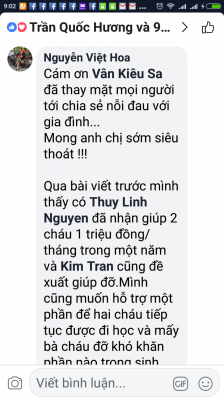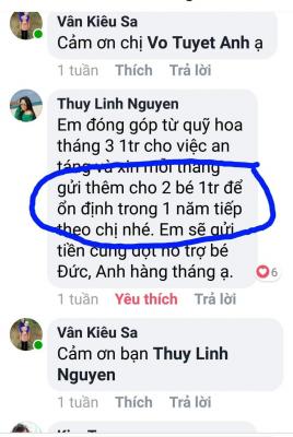 Hiện tại bạn Thuỳ Linh Nguyên đã đăng ký hộ trợ các cháu 1.000.000đ( một triệu đồng)/ tháng trong vòng một năm