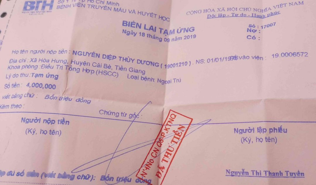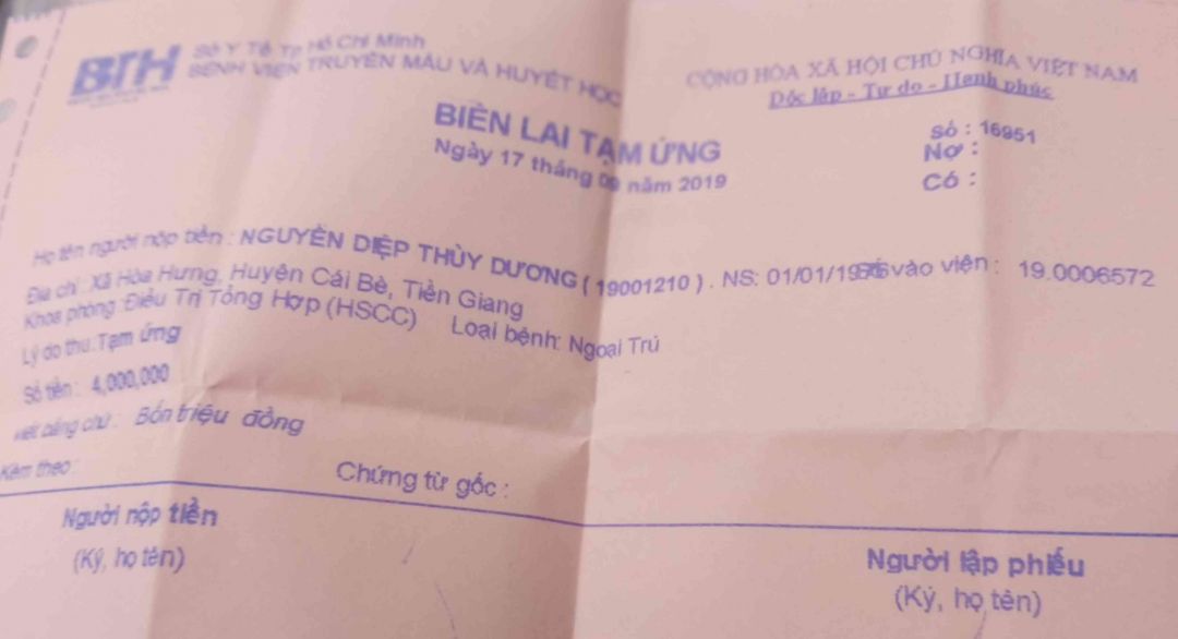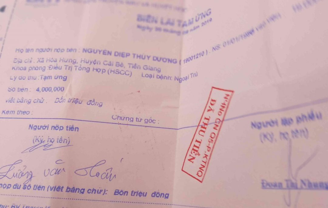 Anh Tuấn chồng chị Dương nói hai ngày trước mới mượn được 4 triệu đồng.chiều ngày 20/ đóng 3 triệu. Hôm nay kêu đóng thêm 3 triệu nữa .anh không biết Đào đâu ra và cũng không biết vay mượn ở đâu gì ở quê Anh đã mượn hết rồi.hiện tại trong túi anh giờ còn không tới 500.000 ngàn, thì làm sao có đủ 3 triệu để đóng cho bệnh viện đây.