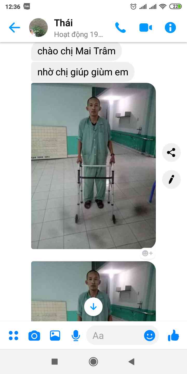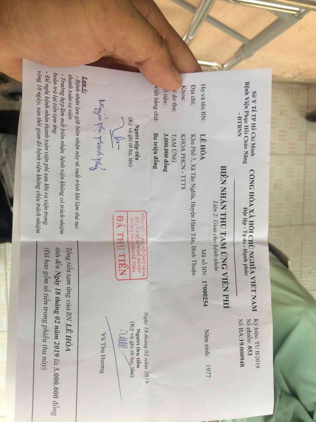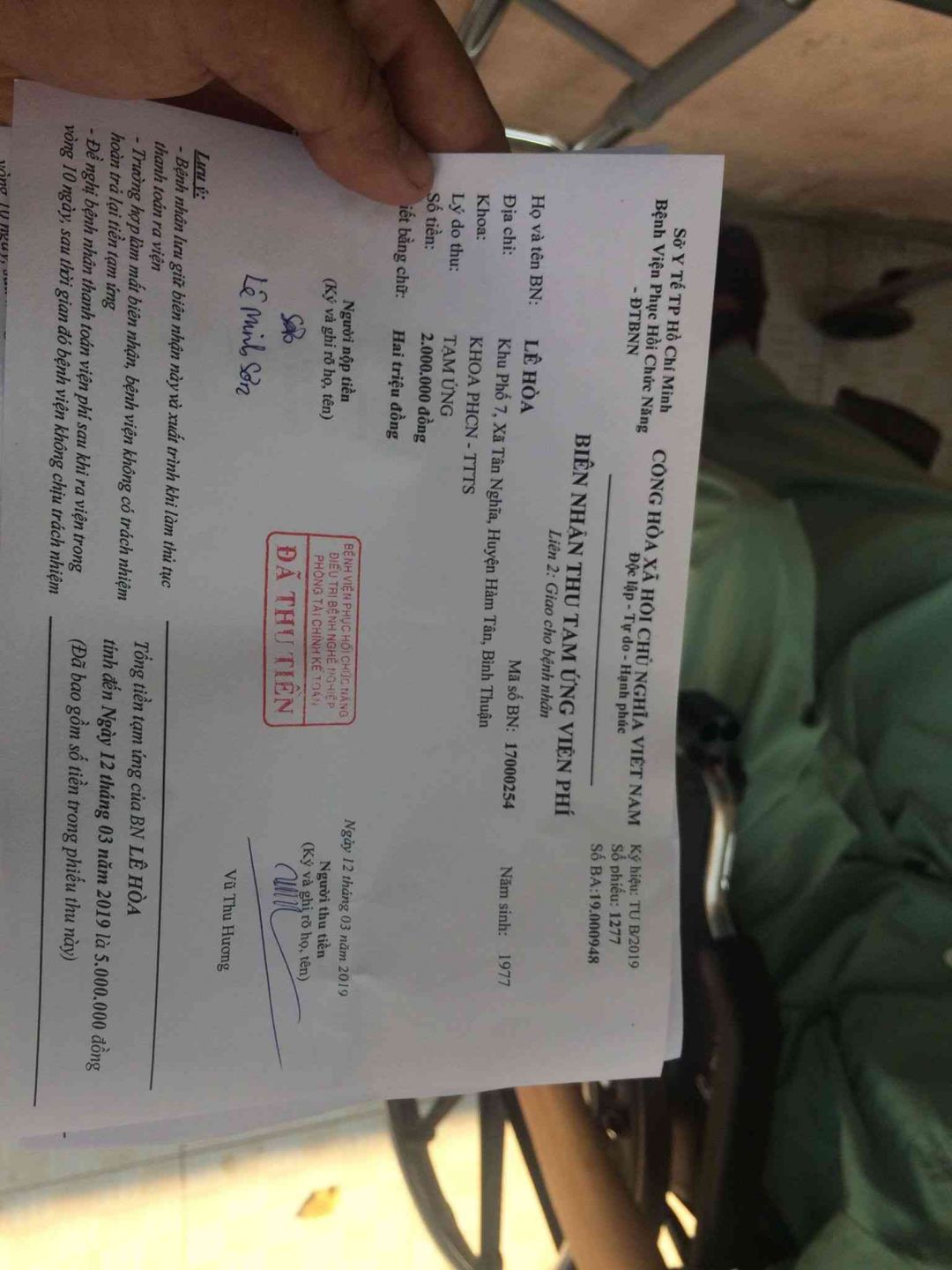 Hai này trước Mai Trâm có vào bệnh viện phục hồi chức năng Quận 8/ thăm một trường hợp em tên Lê Hòa sinh 1977. em bị tai nạn liệt Tứ chi em bị ngày 25 tháng 8 năm 2017 gia đình em có 3 anh chị em ba mẹ em đều đã mất.hơn một năm qua người chị gái chăm lo cho Em. và tai họa ập tới gia đình chị gái em Hòa, con trai của người chị gái bị tai nạn cho nên chị phải bỏ em để nuôi con, hiện em Lê Hòa đang nằm điều trị tại bệnh viện phục hồi chức năng quận 8 đường Âu Dương Lân khóa chấn thương cột sống phòng số 7 em có bảo hiểm y tế em Lê Hòa đang ở một mình và không khả năng đóng tiền tạm ứng bệnh viện tình trạng sức khỏe hiện tại của em tạm thời ổn em đang tập đi khùng.Em nói em cần hai triệu đồng đóng tạm ứng để em tiếp tục được tập vật lý trị liệu.