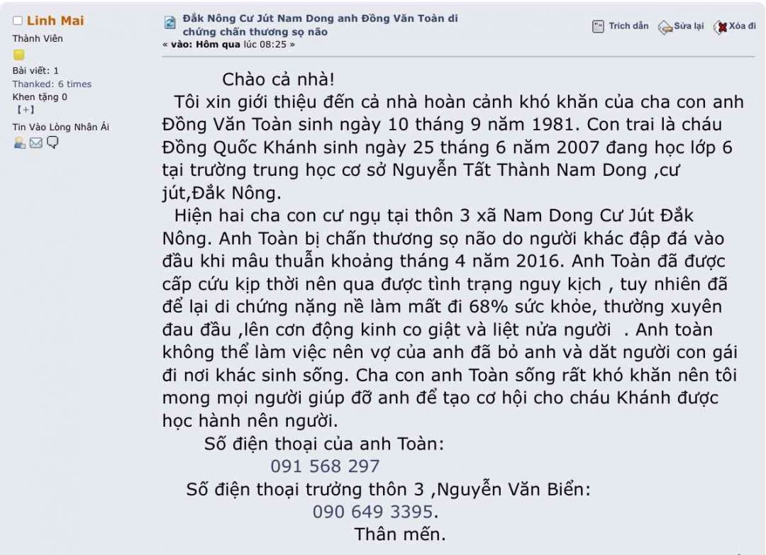 Chào cả nhà tôi xin giới thiệu đến cả nhà hoàn cảnh khó khăn của cha con anh Đồng Văn Toàn sinh ngày 10 tháng 9 năm 1981 con trai là cháu đồng quốc khánh sinh ngày 25 tháng 6 năm 2007 đang học lớp 6 tại trường trung học cơ sở Nguyễn Tất Thành Nam Dong cư jut Đắk Nông hiện nay hiện nay hai cha con cư ngụ tại thôn 3 xã Nam Dong cư rút Đắk Nông anh bị chấn thương sọ não cho người khác đập đá và đầu khi mâu thuẫn làm 4 năm 2016 anh Toàn đã được cấp cứu kịp thời nhưng qua được tình trạng nguy kịch Tuy nhiên đã để lại di chứng nặng nề là mất đi sống 8% do sức khỏe thường xuyên đau đầu lên cơn động kinh co giật và liệt nửa người anh toàn không thể làm việc nên vợ của anh đã bỏ anh anh và các theo lược con gái đi nơi khác sinh sống cha con anh Toàn sống rất khó khăn nhưng tôi mong mọi người giúp đỡ anh để tạo cơ hội cho cháu Khánh được học hành nên người đến thời của anh Toàn 091 568 2971 thân mến