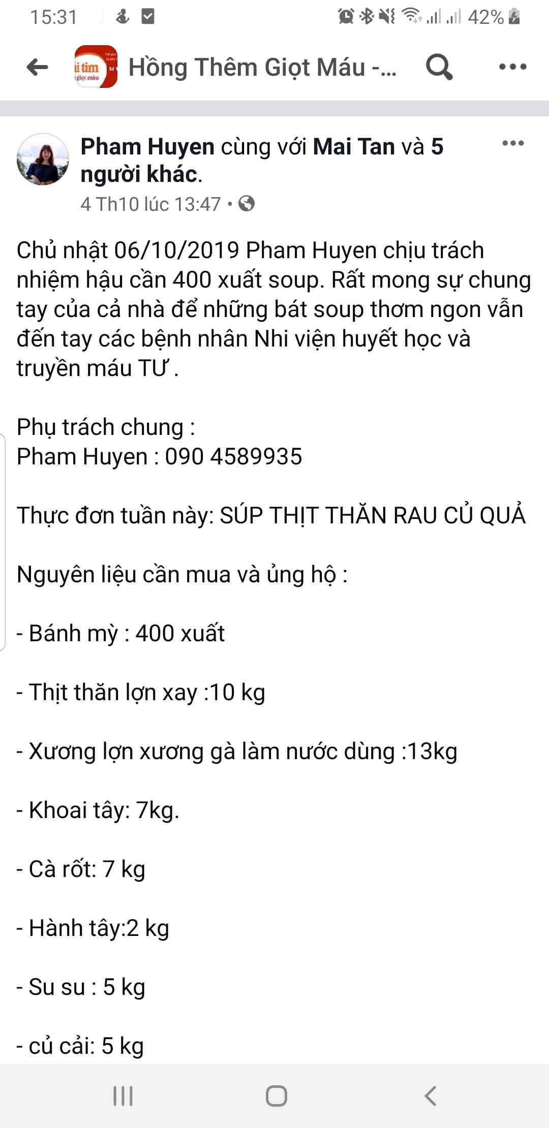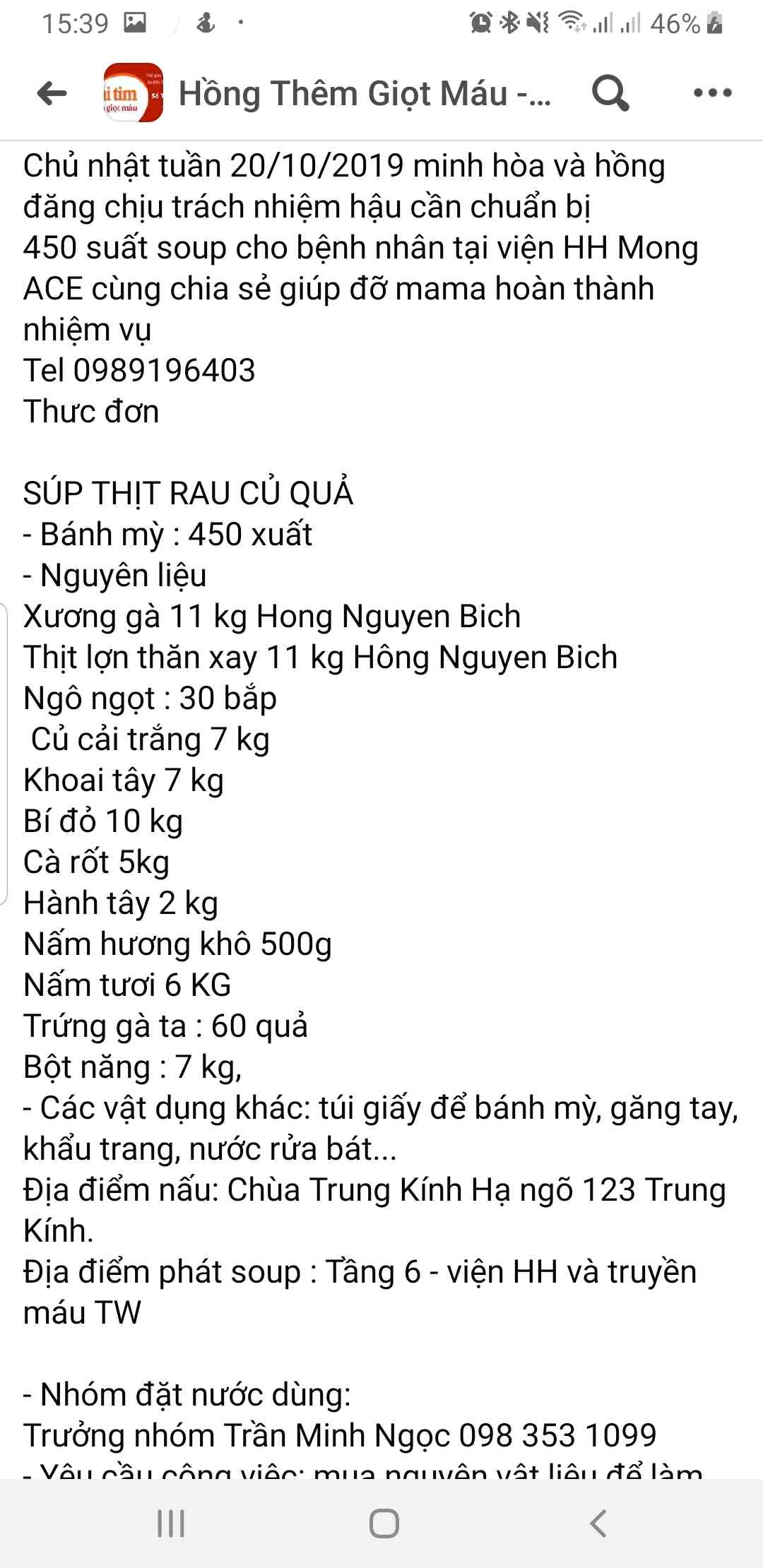 Nồi soup viện huyết học truyền máu TW chủ nhật ngày 20/10/2019 do mama Phạm Minh Hòa và các thành viên trong nồi soup thực hiện.( do ít thành viên tham gia nên mọi người kịp không chụp đc ảnh )