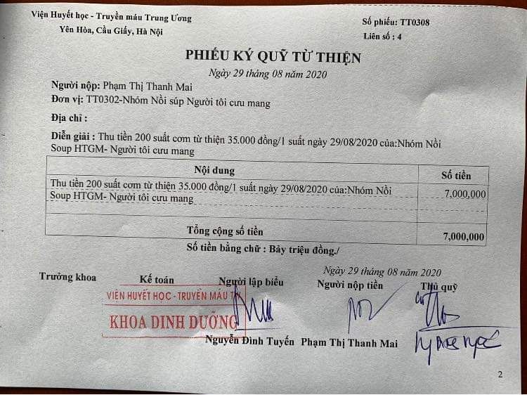 Như đã thông báo từ trước về việc tạm thời dừng tổ chức nấu soup do diễn biến phức tạp và ảnh hưởng của dịch bệnh Covid 19. Nhằm chung tay giảm bớt một phần khó khăn đối với các bệnh nhân trong mùa dịch tại viện huyết học và truyền máu TW . Được sự cho phép của ban quản trị diễn đàn NTCM và ban lãnh đạo bệnh viện. Thứ 7 ngày 22/08/2020, sau khi đã qua kiểm tra sức khỏe, khai báo y tế dưới sự hướng dẫn của phía bệnh viện, Nồi soup Hồng thêm giọt máu - NTCM  đã trao 200 suất cơm tới các bệnh nhân tại viện huyết học và truyền máu TW . Tuy chỉ là 1 bữa cơm nhỏ, nhưng chúng tôi mong rằng nó có thể tiếp thêm động lực  chiến đấu với bệnh tật tới bệnh nhân trong mùa dịch này.