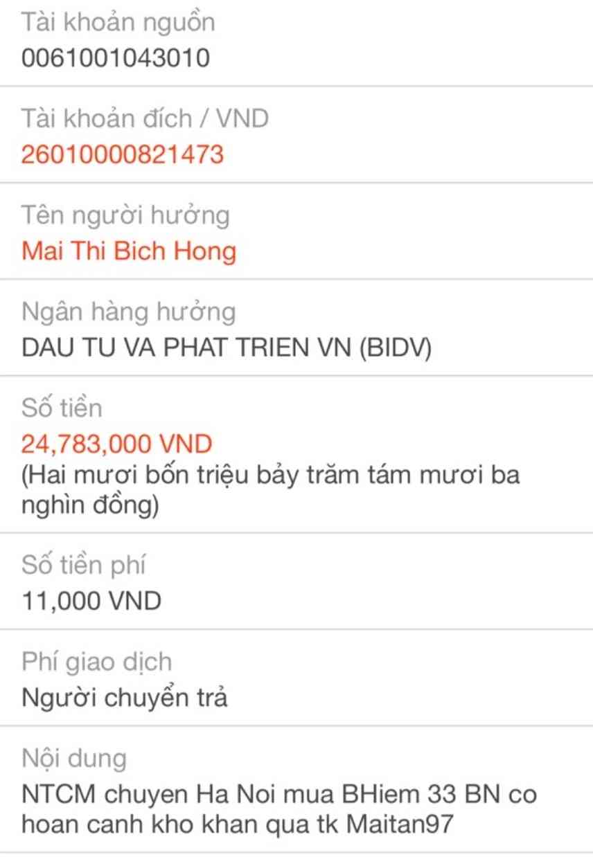 @Thocon : Em chuyển số tiền trên tới tài khoản của bạn Bích Hồng theo đề xuất của Maitan97 dùm nhé.