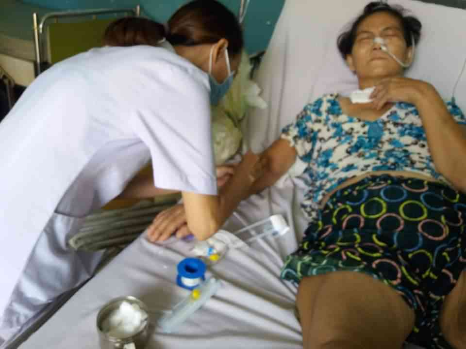 Dạ,sáng giờ ko biết sao con bơm cháo vô cho Mẹ ăn mà Mẹ bị trào ngược ra hết,con hoảng hồn chạy qua kêu y tá đến xem coi Mẹ bị sao,và y tá nói là ống ăn của Mẹ đã cũ quá và bị nghẹt ngay đầu ống rồi nên cần phải thay ống ăn liền,trong quá trình y tá thay ống Mẹ vừa đau vừa mệt lắm nên Mẹ ngất đi một lúc.