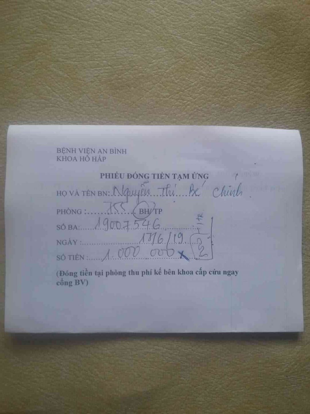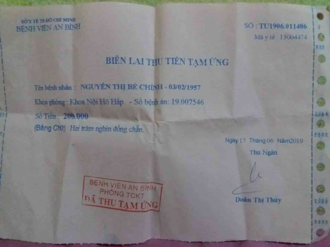 Dạ con xin thưa với cô chú a chị về tình trạng của Mẹ con ạ.Mấy hôm nay chị nhân viên thu phí ở bệnh viện có kêu người nhà đóng số tiền viện phí 2.500 triệu để bệnh viện có thể tiếp tục việc điều trị bệnh tình với thuốc men thêm cho Mẹ mau sớm khỏe lại.Dạ con xin được cảm ơn cô chú a chị, cũng nhờ cô chú a chị đã chung tay giúp đỡ hỗ trợ thêm chi phí chữa trị cho bệnh tình Mẹ con,nên con đã chạy vay thêm để đủ số tiền đóng viện phí cho Mẹ con ạ.
