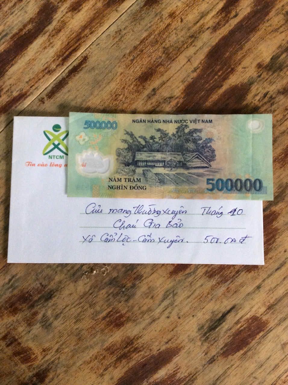 LNLB đã nhận 200.000₫ CMTX tháng 2 cháu Gia Bảo. Thay mặt nhóm Hà Tĩnh xin gửi lời cảm ơn tới Ben nhiều ạ.