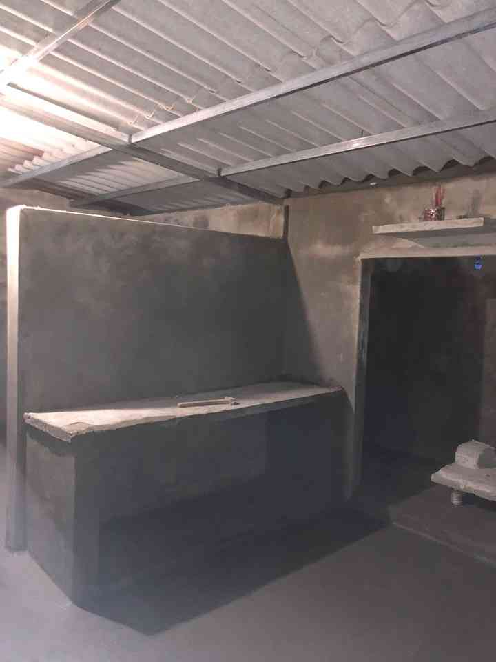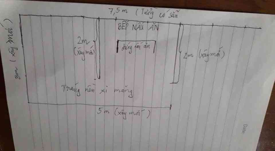 Và mấy AE Quảng Trị đã dự toán sửa nhà bếp như sau: Nhà trên là nhà đại đoàn kết đã được hoàn thiện, nhà lều chưa tô, nên tô lại nhà lều, còn dở bỏ nhà bếp cũ, xây tô, bao che lại (hình vẽ), tận dụng được 1 lối bro cũ.
