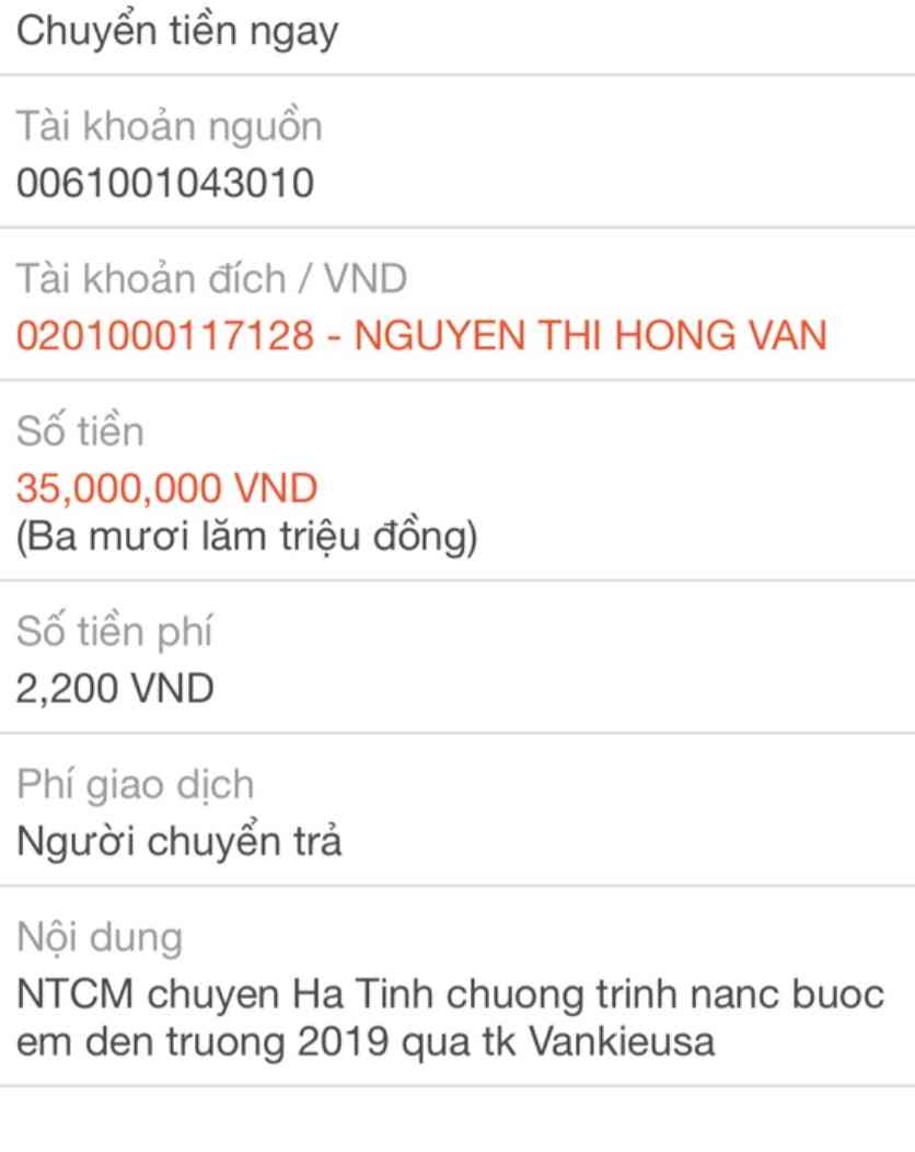 @Thocon : Em chuyển tới Vânkiêusa 35,000,000đ để các bạn khu vực Hà tĩnh chuẩn bị hàng hóa thực hiện chương trình dùm nhé.