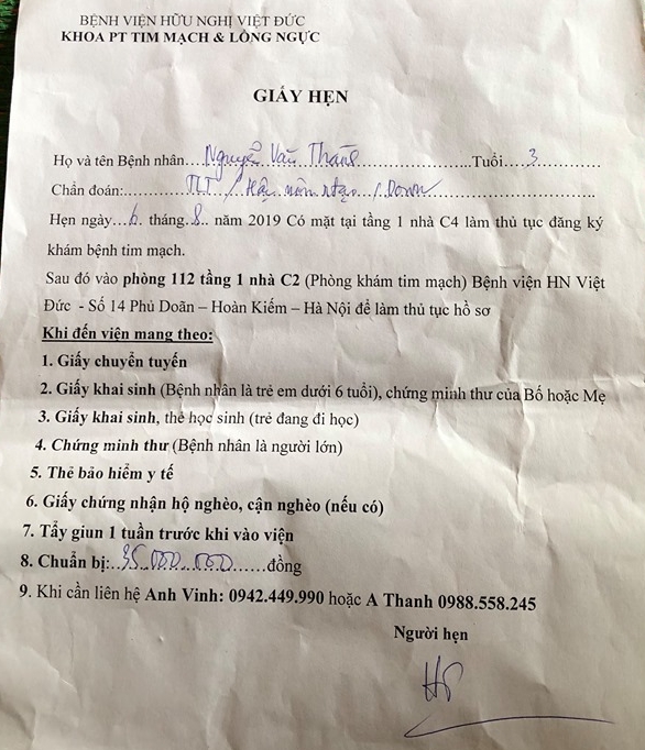 Theo hình chụp giấy hẹn mà Trường Giang đăng thì ngày 6/8/2019 bé được hẹn xuống bệnh viện Việt Đức để khám tim mạch các bạn nhé.