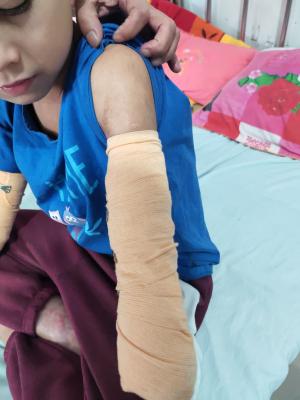 Qua trao đổi với bố cháu thì cháu bị tai nạn vào hôm thứ 5 ngày 17/10/2019, sau khi bị điện giật gia đình đưa đi sơ cứu ở bệnh viên Ba Lan thành phố Vinh sau đó chuyển thẳng lên bệnh viện bỏng. Do bị phóng điện nên cháu bị cháy tay và phần dưới nách + chân. Hiện tại cháu đã bị tháo từ 2 khỉu tay trở xuống, phần còn lại đã có tiến triển tốt hơn nhưng vẫn có nguy cơ tháo cả cánh tay trên từ vai xuống (Hi vọng cháu không bị tháo vì nếu tháo cháu rất khó lắp tay giả), chân cháu bị bỏng nặng tuy nhiên hiện tại cũng đã tiến triển tốt hơn có khả năng không phải tháo từ đầu gối xuống.