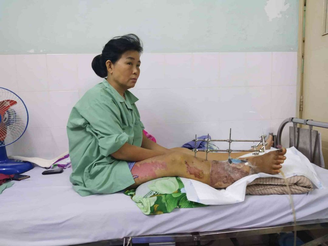 Chân chị bị dập, gãy sương, mổ và ghép xương và da đợt 1 không thành công nên hiện giờ chị phải dưỡng thương đợi đợt mổ lần 2.