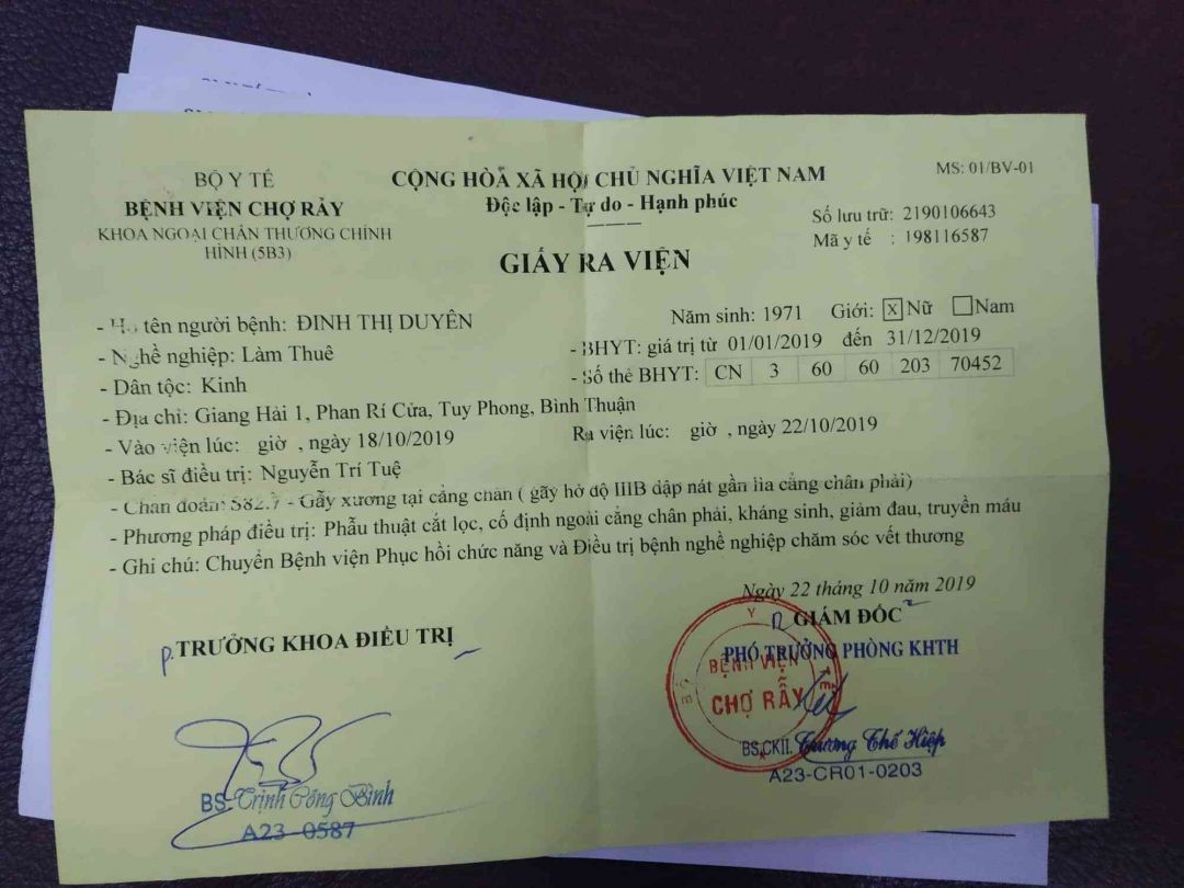 một số thông tin cùng giấy ra viện và hình ảnh xe cấp cứu mà chị Duyên đi về nhà .