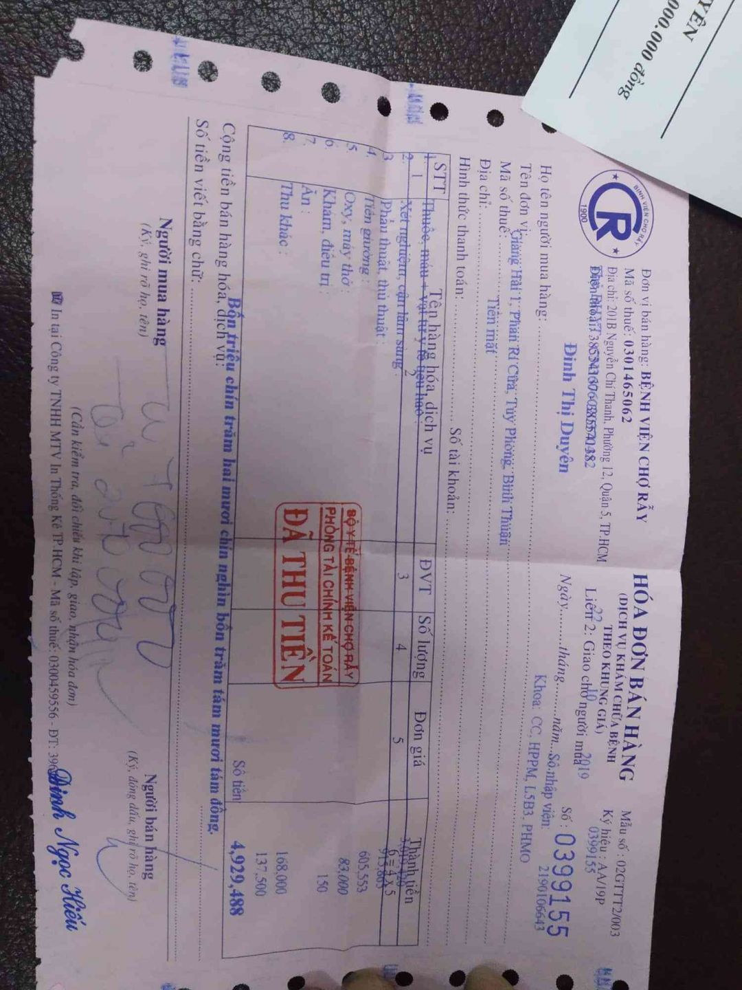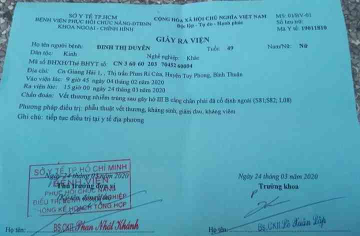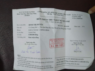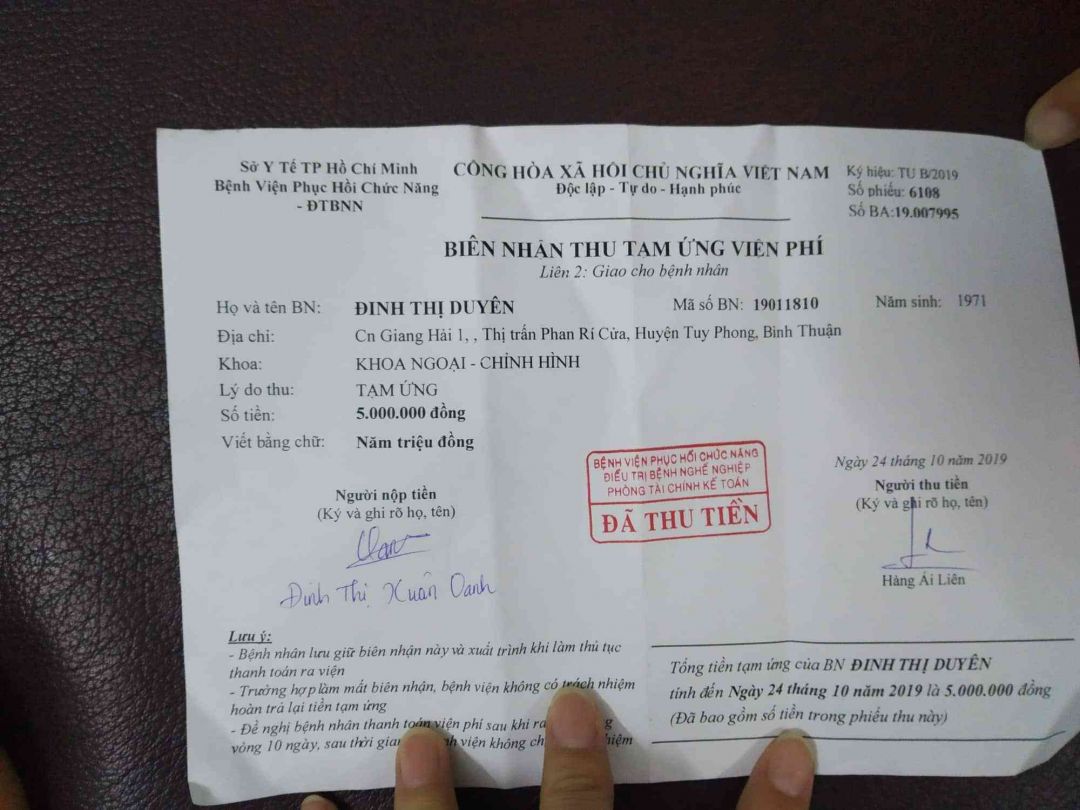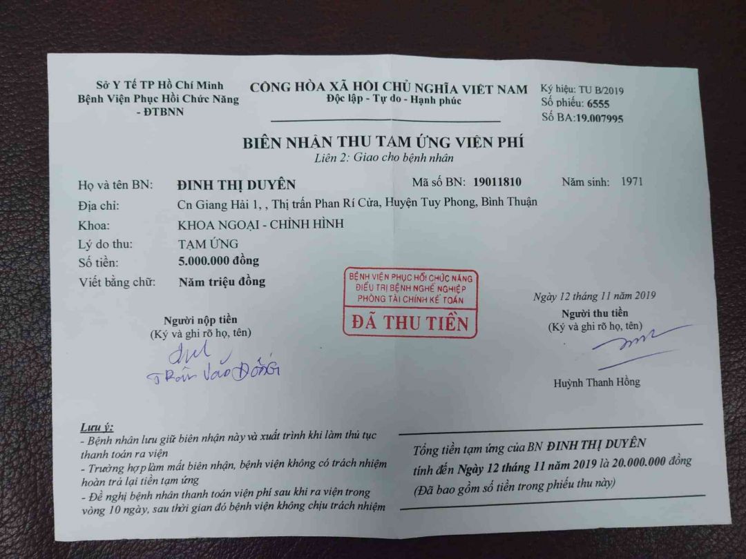 Chị xin giấy  chuyển lên BV chợ rẫy để phẫu thuật lần đầu  , được khoảng hơn một  tháng đóng tạm ứng 10.000.000₫  ,thì chuyển qua BV Phục Hồi Chức Năng Quận 8 . điều trị và theo dõi . Qua BV mới phải đóng tạm ứng hết 20.000.000₫ , chị đi mượn những người quen để có tiền đóng tạm ứng  và điều trị .