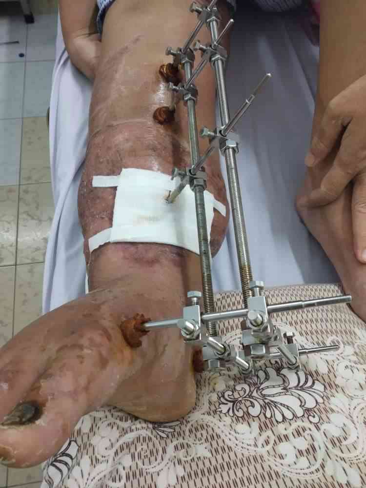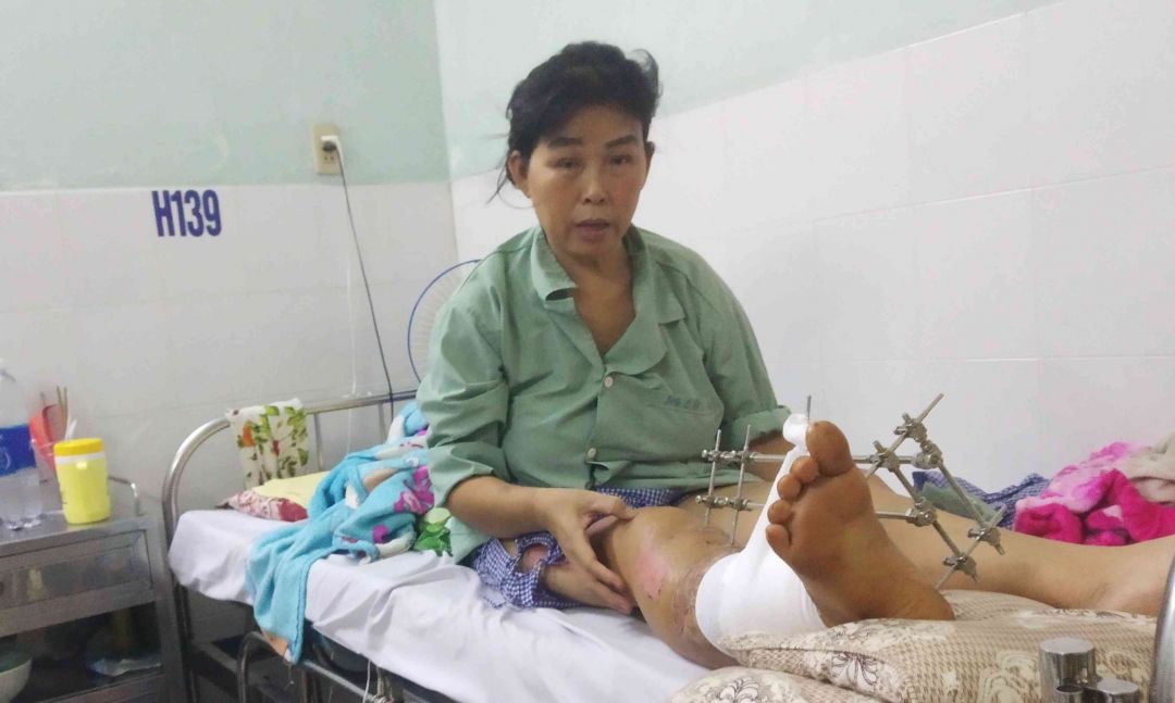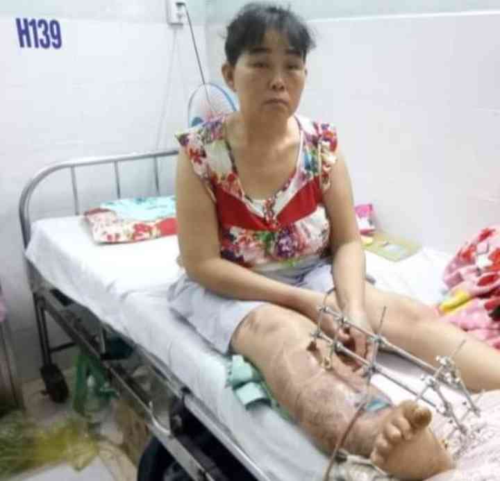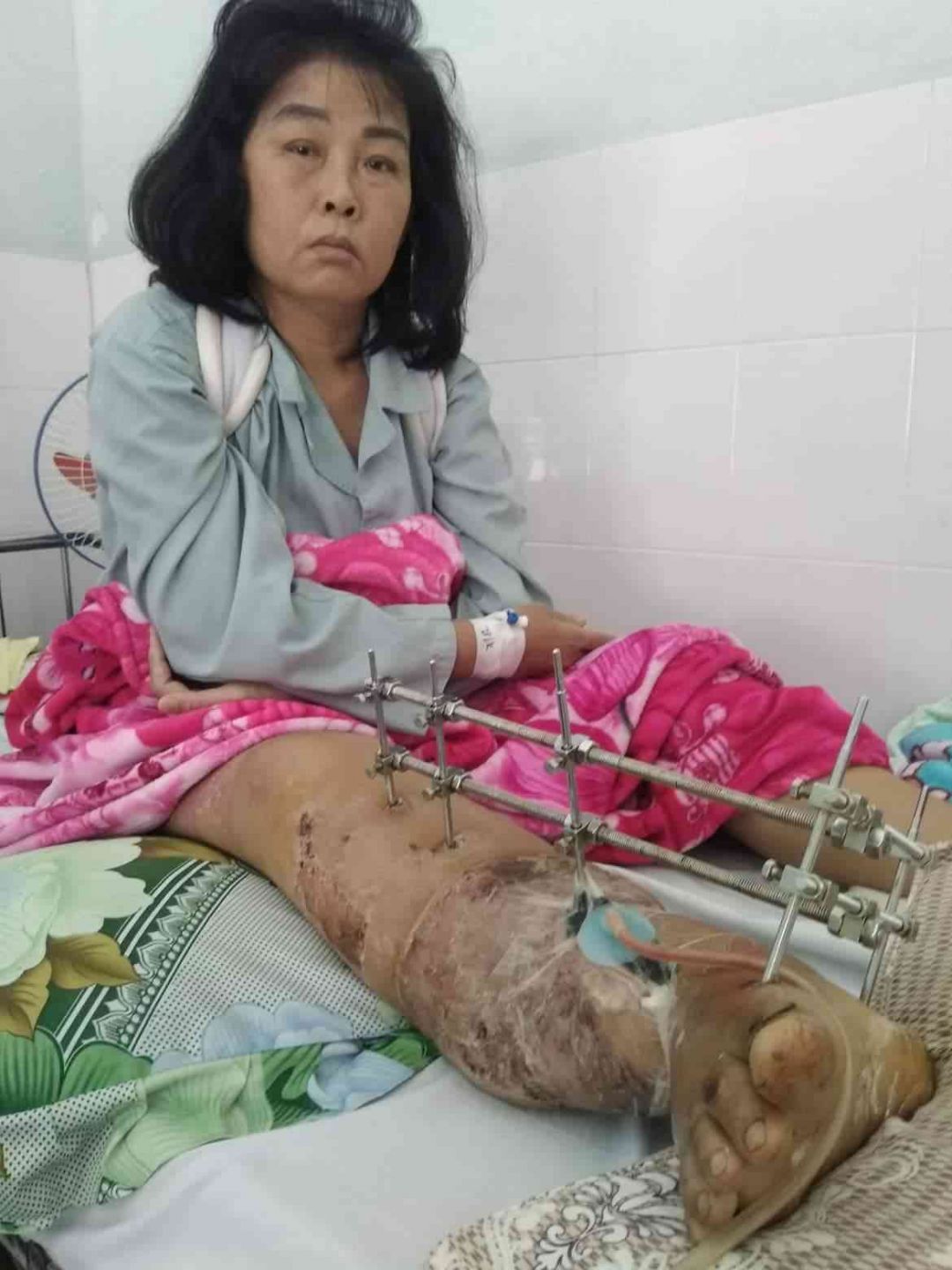 Chân chị bị dập, gãy sương, mổ và ghép xương và da đợt 1 không thành công nên hiện giờ chị phải dương thương đêt đợi đợt mổ lần 2.