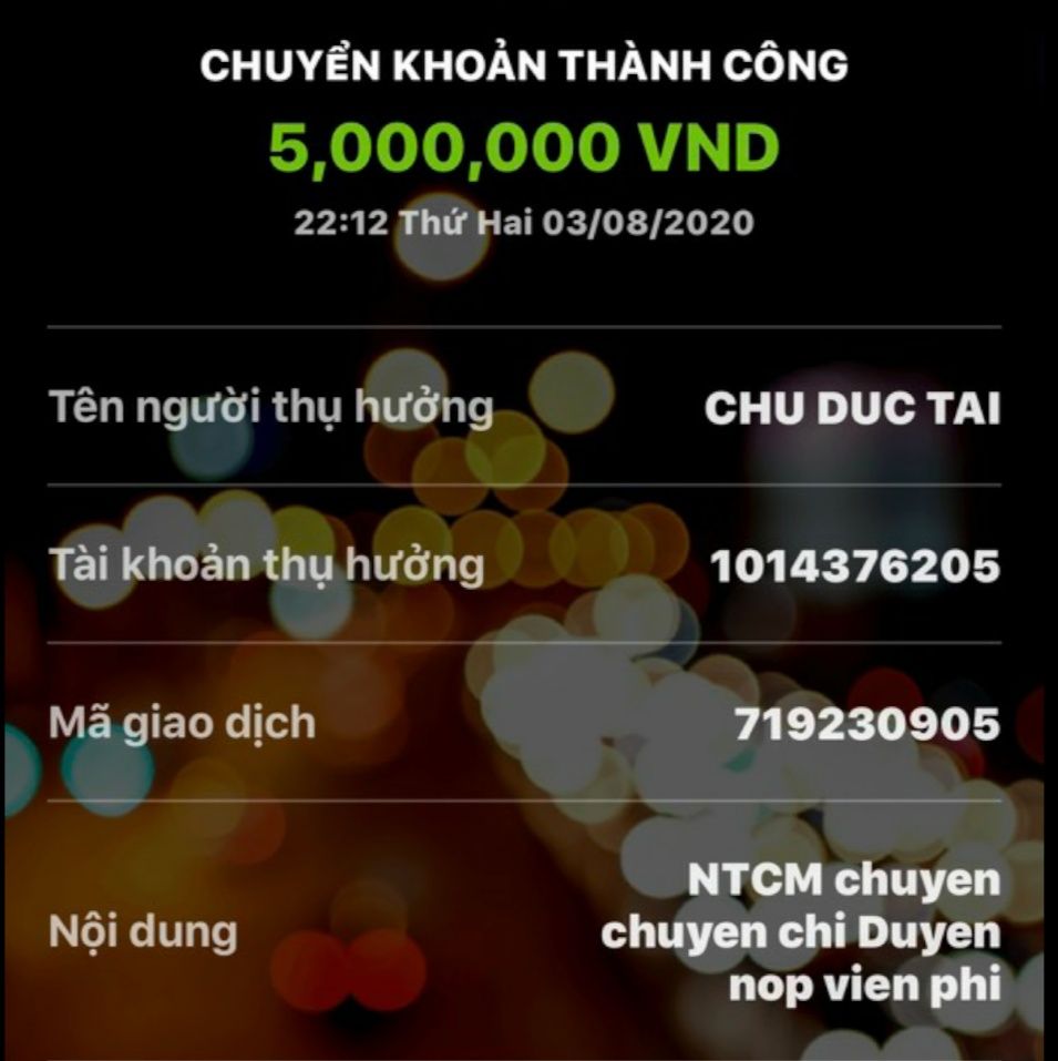 Tối ngày 04 tháng 08 DucTai cùng bạn @Kim Hân đã gửi 5,000,000VND tiền CMKTX từ gia đình @locnguyen , @michele_du và quý MTQ đến chị Duyên.