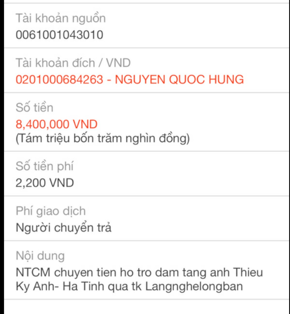 @Thocon : Em chuyển tới bác Lắng nghe lòng bạn 8,400,000đ tiền các bạn hỗ trợ đám tang của anh Thiệu dùm nhé.