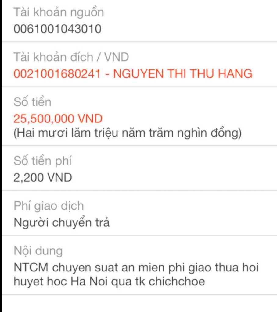 Thocon chuyển 23,500,000đ tới Duyen Tuong để các bạn khu vực Hà Nội thực hiện chương trình dùm nhé.