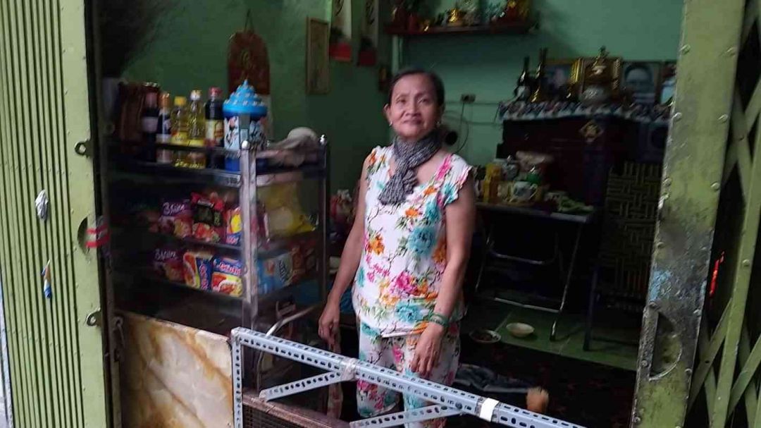 Cô Hóa hiện đang bán tạp hóa, nói là tạp hóa nhưng trên kệ tủ của cô có mấy gói mì tôm và mấy chai dầu ăn + nước mắm, cô nói có bao nhiêu tiền thì mua về bán bấy nhiêu thôi, hàng xóm họ thương họ cũng ủng hộ.
