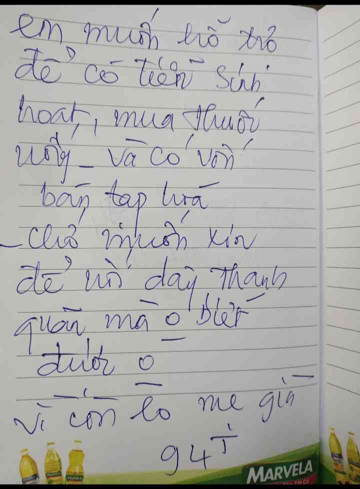 cùng chị.chị không nói chuyện được . trao đổi với chị bằng cách Mai Trâm thì viết tin nhắn bằng điện thoại chị đọc chị viết ra giấy cho Mai Trâm đọc .mong muốn của chị được các nhà hảo tâm giúp chị có một số vốn để mở tiệm tạp hóa nho nhỏ để tự trang trải cuộc sống lo cho mẹ già 94 tuổi Mai Trâm hỏi chị cần bao nhiêu vốn thì chị nói có bao nhiêu cũng được.