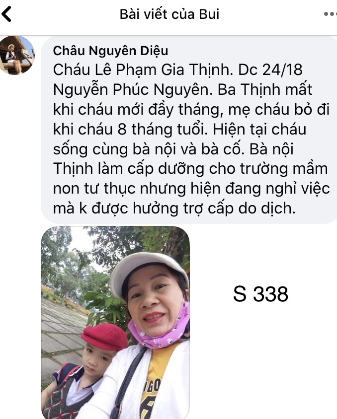 Thịnh là bạn Học cùng lớp 1 với bé Thỏ (con gái của em), đầu năm học cô Châu là cô giáo chủ nhiệm đã biết hoàn cảnh của cháu và đã kiêu gọi hội phụ huynh trong lớp (trong đó có em) hỗ trợ kinh phí giúp cháu thêm phần quà mua vở và áo quần!