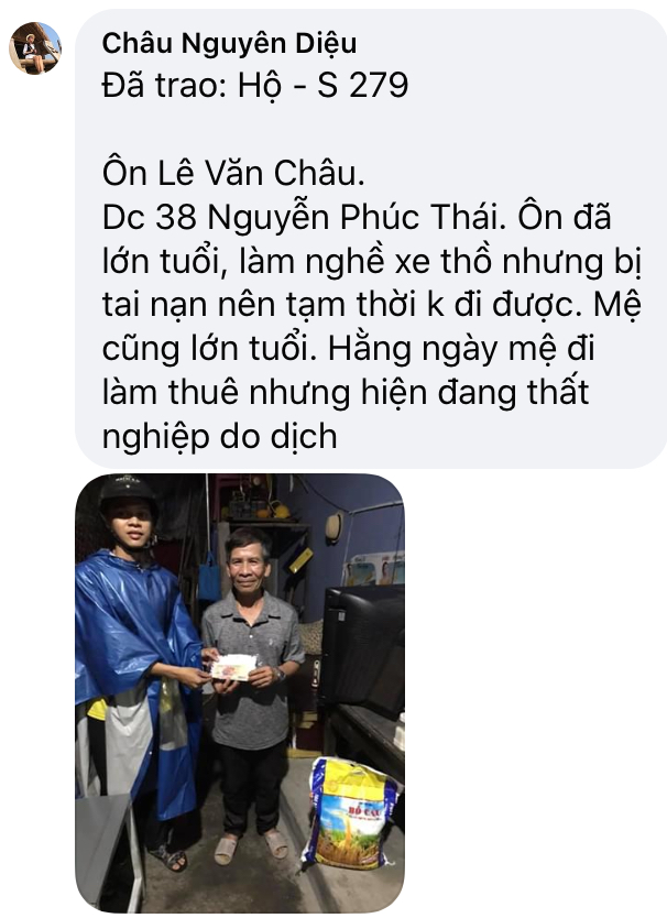 Sáng nay nhóm các bạn Huế đã chạy xuyên trưa để kịp gửi đến 50 suất quà NTCM hỗ trợ kịp cho bà con, lúc nhóm đến trao quà có mấy cháu nhỏ đang ngồi lặc rau lang trước nhà là hò reo gọi ba mẹ ông bà ra đón nhìn con nít ngây thơ,  yêu quý mình như vậy bọn e rất vui, hỏi ra mới biết lý do các bé vui vì các bé còn nhớ các anh chị hôm đến thăm nhà, xác minh hoàn cảnh để xin hổ trợ gạo và tiền mua thịt cá cho bé, có bé út hỏi: ‘ chị chị...khi ‘mô ‘là bọn e được có hỗ trợ mua cá’ thì các thành viên im lặng chỉ dám trả lời là ‘chị không dám hứa nhưng mong là sẽ sớm thôi em’ nà” con nít nghe xong ghi nhớ và chờ đợi, ngay khi thấy mấy anh chị đến lại là bé sung sướng vì anh chị đã giữ lời hứa quay lại và mang theo món quà của lòng nhân ái đến với các em! Nhận gạo và 200k tiền mặt xong bé lớn chạy ù đi chợ mua thịt cho mấy đứa em kịp cơm, người mẹ thì khui bao gạo nấu liền kịp cơm trưa, bọn trẻ thì được nụ cười sung sướng , còn tiễn mấy anh chị ra Tân ngõ hihi!!!