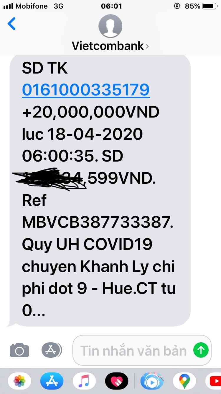 Quỹ ủng hộ hoàn cảnh khó khăn mùa Covid19 đã chuyển TK Khánh Ly 20,000,000đ đợt 9 .