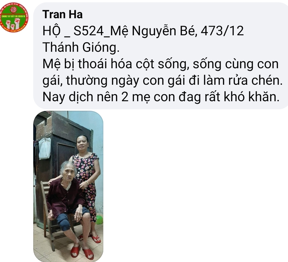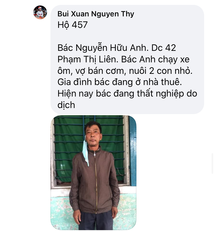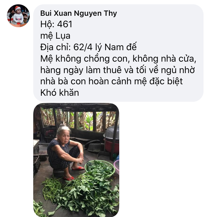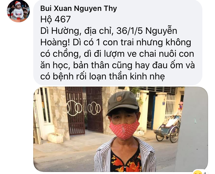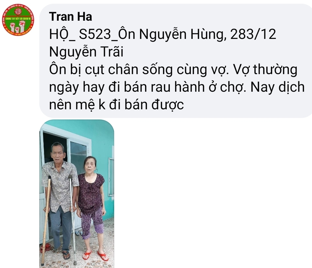 Có một hoàn cảnh, mấy năm nay điều đặn ra nhận cháo về ăn, Chờ phát cho bệnh nhận xong mới nhận. Còn nhiều lấy nhiều còn ít lấy ít. Rất hiền và tội; mình không biết chú ở đâu, tình trạng khổ. Nếu các bạn kết nối được thì quá tốt. Xin cảm ơn.