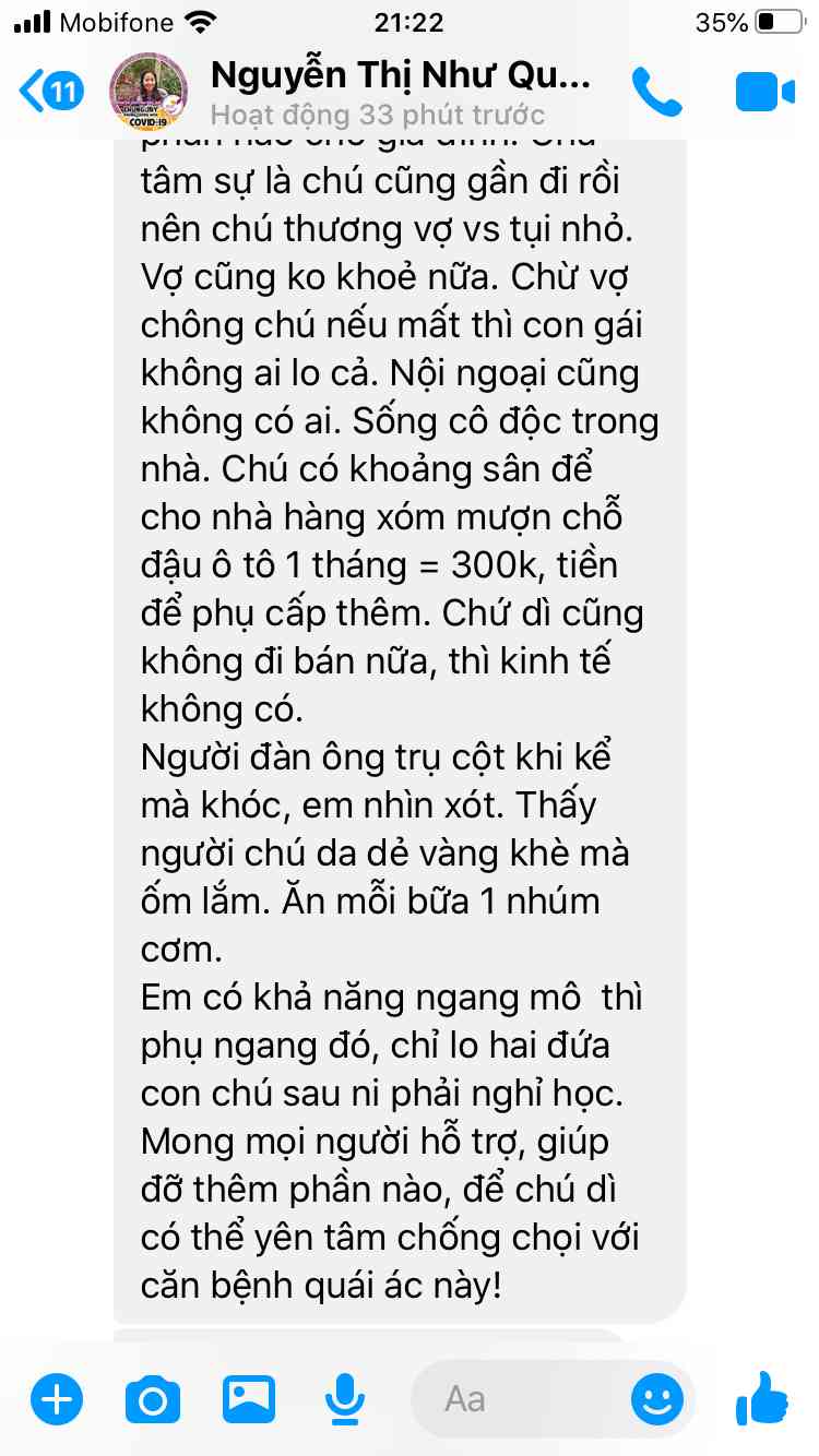 Trước tình cảnh chú hiện tại em xin đề xuất hỗ trợ gấp cho chú và gia đình tiền mặt để kịp thời điều trị cho chú và giúp vợ chú xạ trị theo đúng lịch bệnh viện để dì được duy trì sức khỏe lo cho 2 con nhỏ, cho chồng và mẹ già! Phương án xấu nhất là chú ra đi, chúng ta sẽ đề xuất kinh phí hỗ trợ mai táng giúp chú! Hiện nhà chú đã quá cảnh kiệt về kinh tế và sức khỏe, kính mong cả nhà hỗ trợ cho chú và nhìn chú rất thương tâm ạ!!!