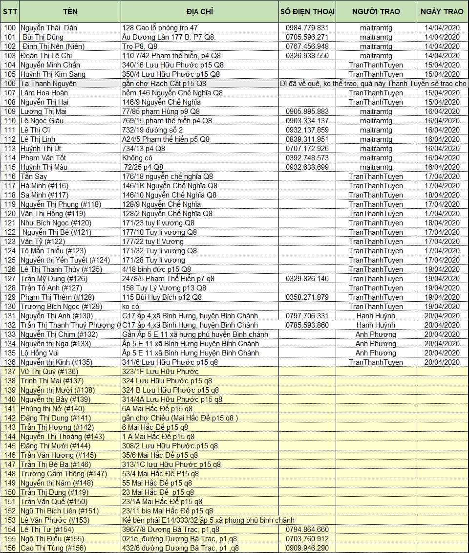 - Tổng số t/h: 152 (Đã loại trừ t/h cô Tạ Thanh Nguyên Stt 106 (ko thể trao quà, và chuyển phần quà cho ng khác))