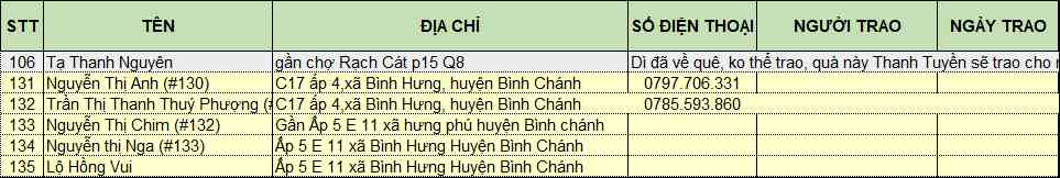 - Tổng số t/h: 132 (Đã loại trừ t/h cô Tạ Thanh Nguyên Stt 106 (ko thể trao quà, và chuyển phần quà cho ng khác))