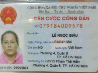 Chị tên Lê Ngọc Giàu sinh 1984 số địa chỉ trên chứng minh nhân dân là nhà của chị đã bán cách đây 11 năm hiện tại chị đang ở trọ địa chỉ mới 769/15 phạm thế hiển phường 4 Quận 8  và số liên lạc với chị Giàu 0903334137.