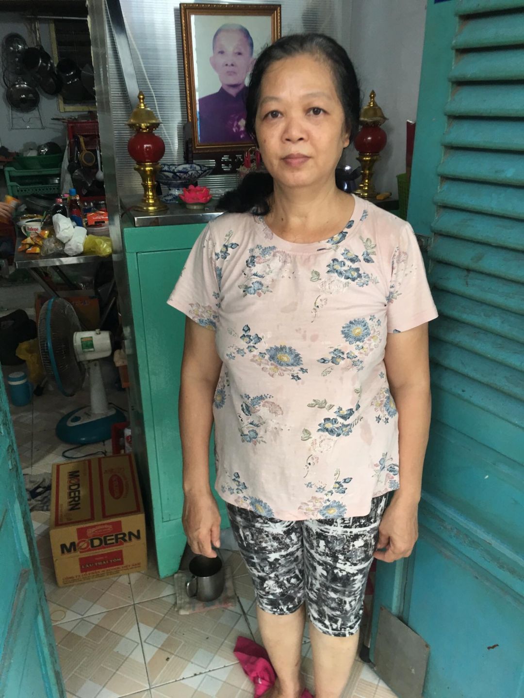 Chị Mai Kim Sang 55 tuổi, công nhân vệ sinh bệnh viện Chợ Rẫy. Chồng bị thoái hoá cột sống do chấn thương , nuôi 3 con còn đi học.