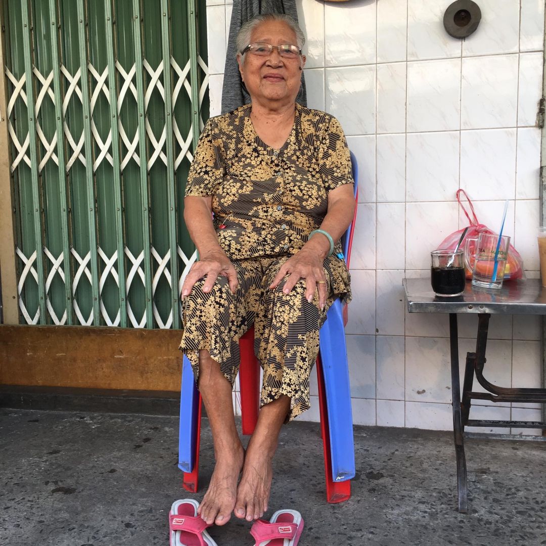 Cụ Dương Thị Ba, 87 tuổi, sống cùng con trai làm bảo vệ nuôi 2 con đi học, con gái bán vé số nuôi 2 con đi học.