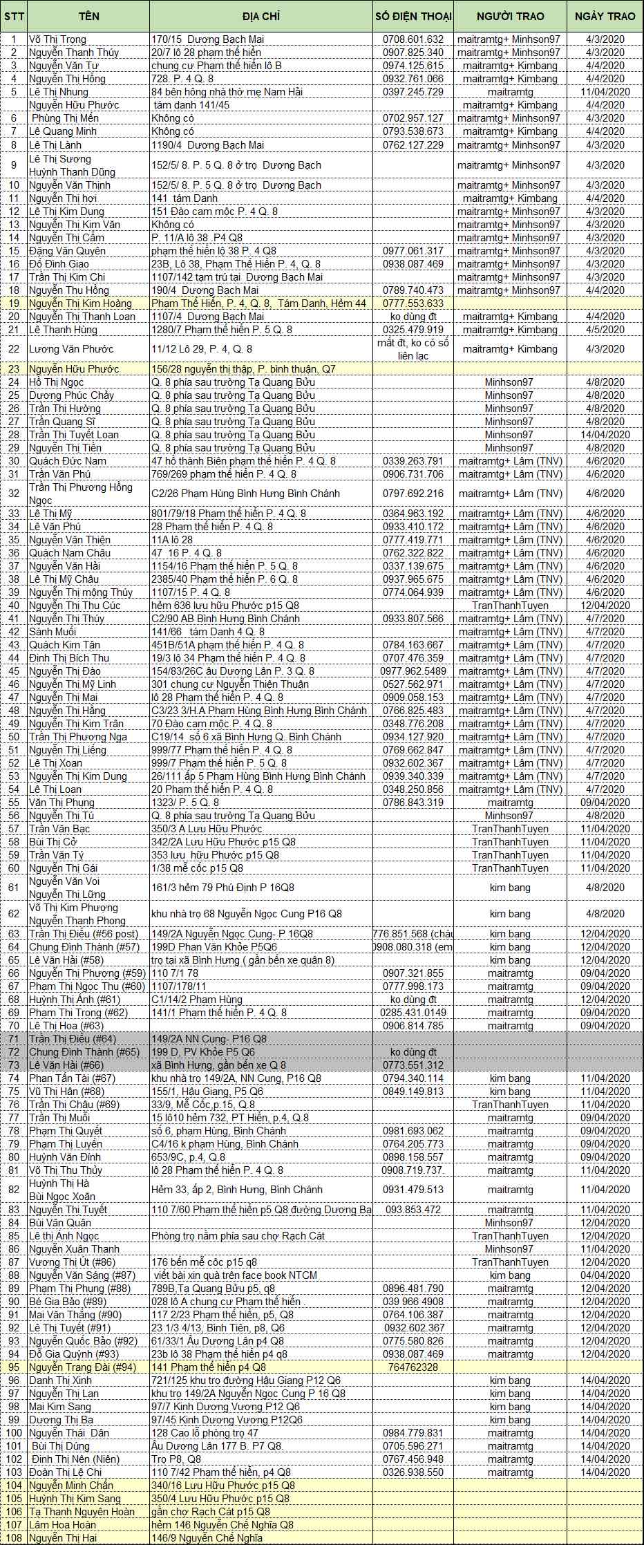 Chi xin được cập nhập bảng thống kê chi tiết các trường hợp đã được giới thiệu để mọi người theo dõi. Số liệu được tính đến ngày 14/04/2020: