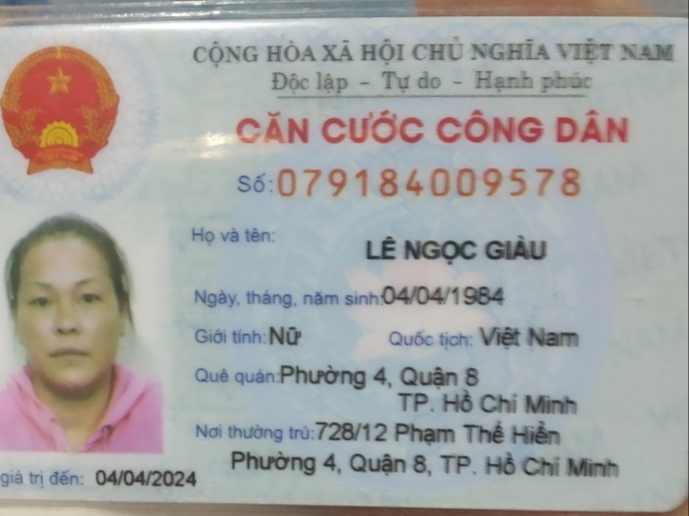 Chị tên Lê Ngọc Giàu sinh 1984 số địa chỉ trên chứng minh nhân dân là nhà của chị đã bán cách đây 11 năm hiện tại chị đang ở trọ địa chỉ mới 769/15 phạm thế hiển phường 4 Quận 8  và số liên lạc với chị Giàu 0903334137.