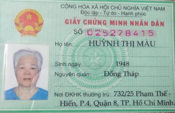 Cô tên Huỳnh Thị màu sinh 1948 cô không chồng con ba mẹ mất hết quê quán ở Đồng tháp nhưng lên Sài Gòn tạm trú tạm vắng 25 năm chính quyền địa phương thấy cô Hoàn cảnh đơn thân có một mình nên cũng chấp cho cô nhà tình thươngđịa chỉ nhà tình thương 72/25 phường 4 quận 8. cô sống bằng nghề mua bán vé số bây giờ thất nghiệp.