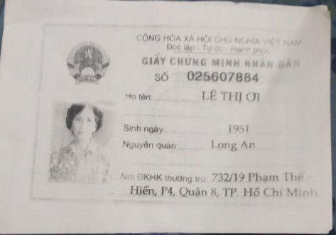 Bà tên Lê Thị Ơi sinh 1951.địa chỉ thường trú 732/19 đường số 2