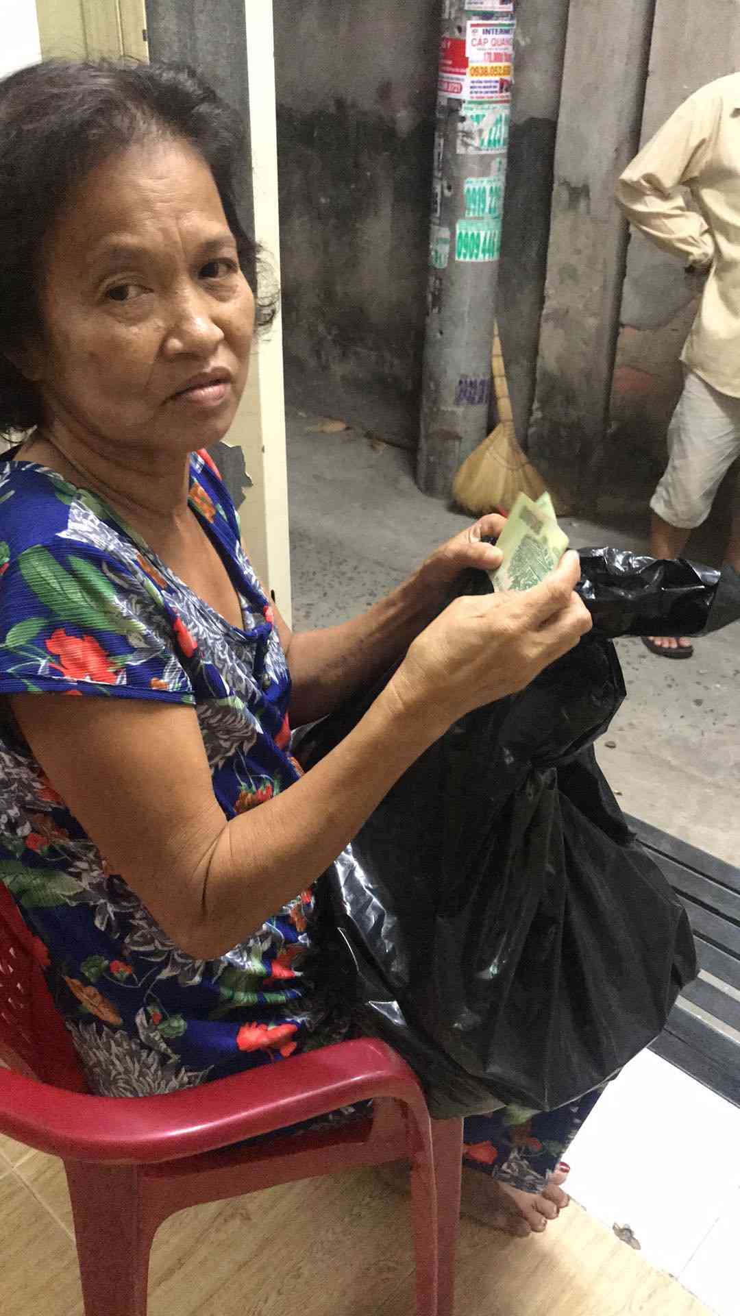 Là Cô Đoàn Thị Ra ,sinh năm 1962, hiện cô đang sống trong miền nam một mình,cô đi lượm ve chai hằng ngày để kiếm sống và nuôi chồng bị chấn thương sọ não đang nằm ở ngoài quê,cô ở phòng trọ tại .
