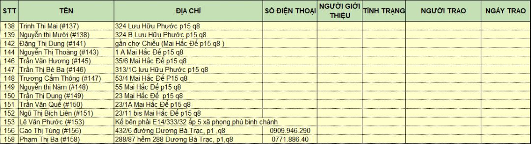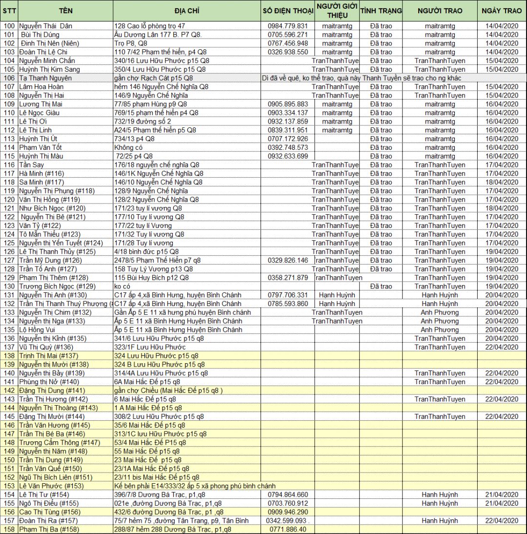 ** Bảng phụ màu vàng là 19 trường hợp chưa được trao quà