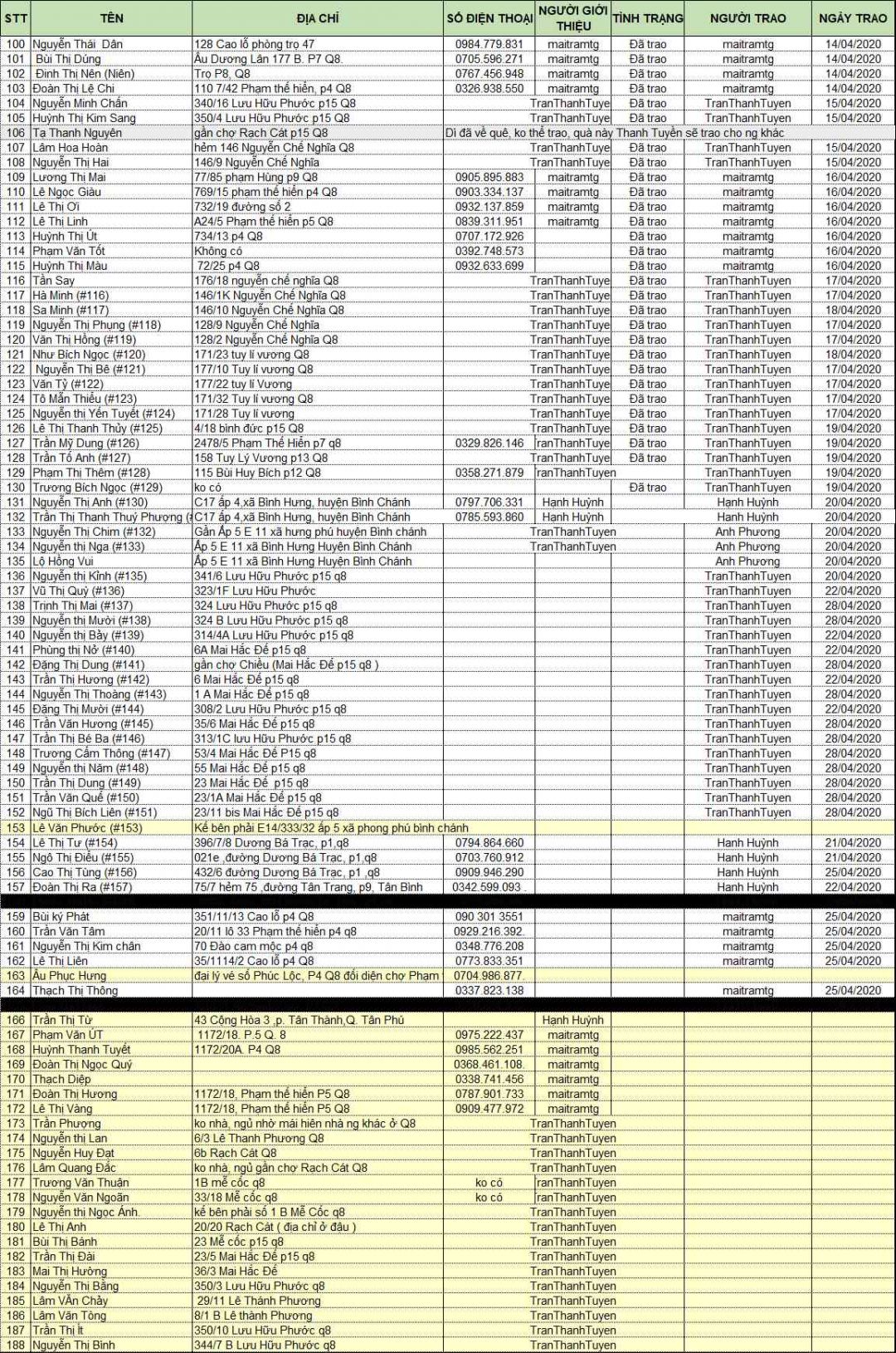** Bảng phụ màu vàng là 25 trường hợp chưa được trao quà