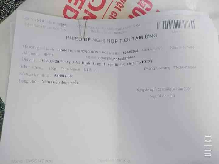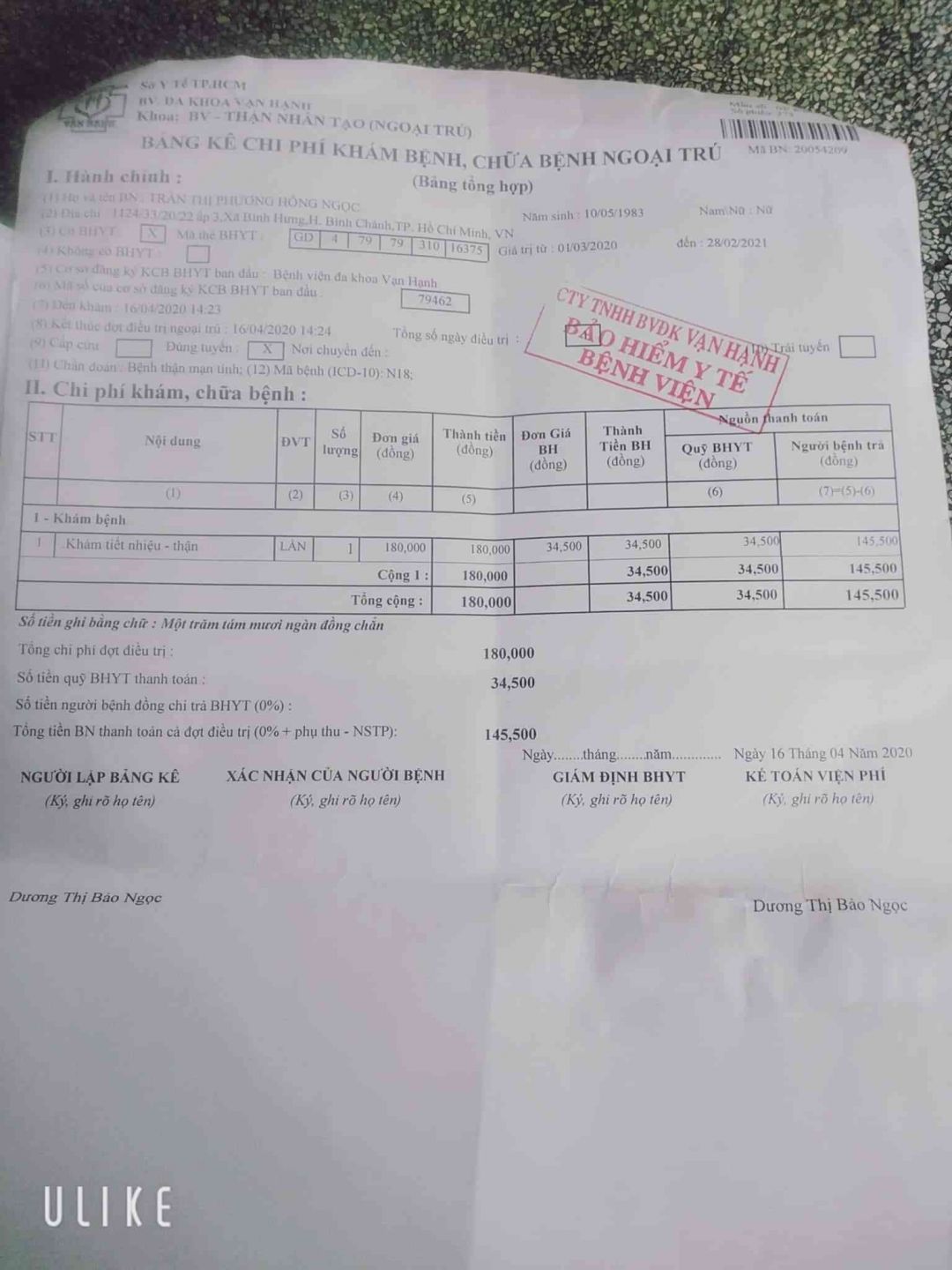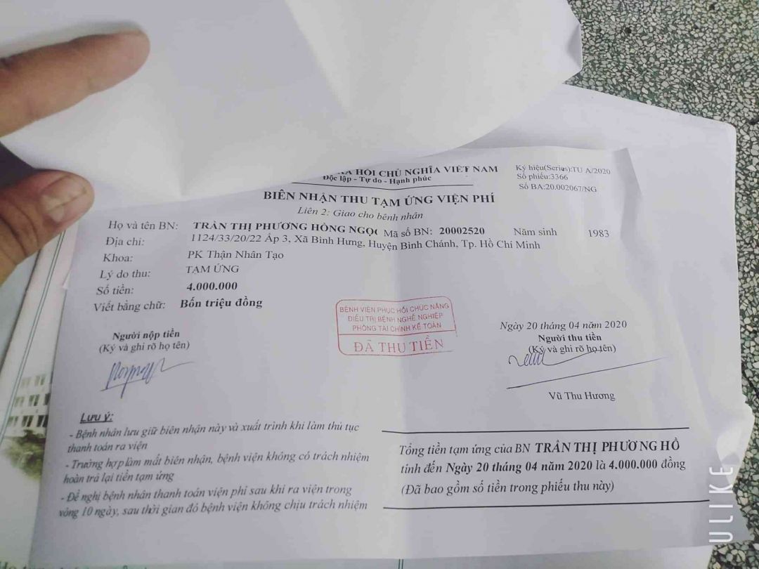 Sáng nay Ngọc có đến bv quân 8 xin chạy thận, ở đây tiếp nhận thẻ BHYT nhưng bệnh nhân chạy thận quá nhiều, không đủ máy nên bv hẹn khi nào có máy trống thì báo. Để duy trì việc chạy thận được liên tục, bv giới thiệu sang bv phục hồi chức năng ( PHCN) quận 8, ở đây có máy nhưng không chấp nhận thẻ BHYT của Ngọc vì đăng ký tại bv đa khoa Vạn Hạnh, cũng không đồng ý cho cô ấy mua BHYT vì hộ khẩu ở Bình Chánh. Nếu muốn chạy thận phải đóng tạm ứng 3.000.000₫( 600.000₫/ lần chạy ko BHYT). Cô ấy đành phải đóng tiền để được chạy thận!