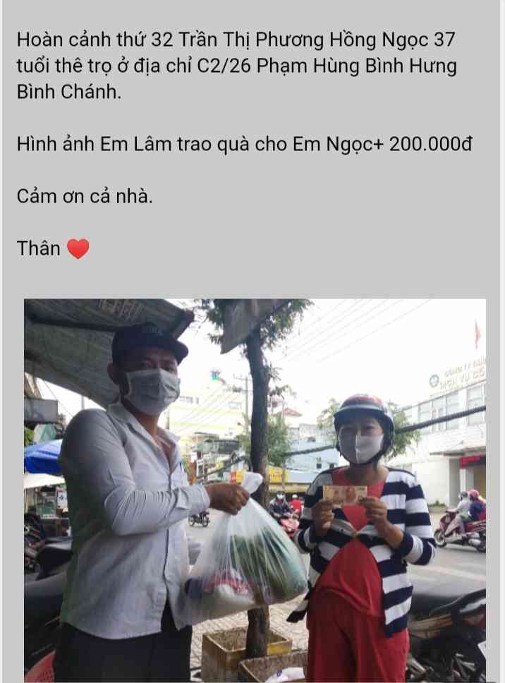 Hiện ngụ tại C2/26 đường Phạm Hùng- xã Bình Hưng- huyện Bình Chánh, là phòng trọ của người chị thuê, phụ tiền phòng là 170.000đ/ ngày, ăn uống tự lo. Cuộc sống của ba mẹ con cũng có thể đắp đổi qua ngày với nghề bán vé số nhưng hiện giờ cuộc sống đang cùng quẫn vì em phát bệnh và lệnh tạm ngưng bán vé số. Hiện em chỉ còn 1.200.000₫ , tuy không bán vé số và phát bệnh nhưng vẫn phải đóng tiền nhà là 170.000₫/ ngày. Em chưa được huỏng trợ cấp 750.000₫.