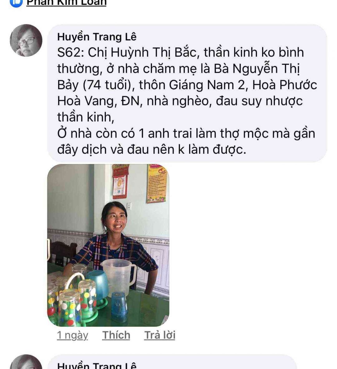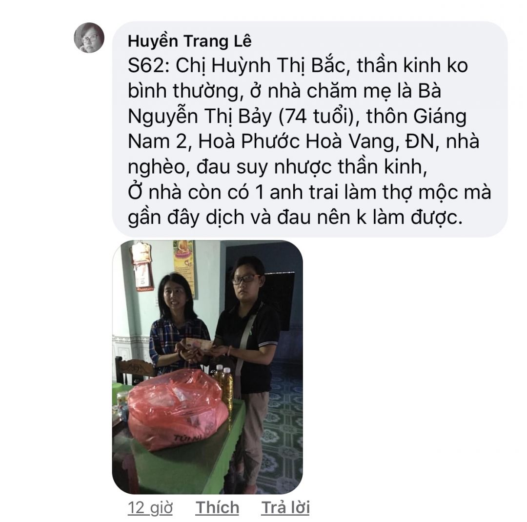 S62: Chị Huỳnh Thị Bắc, thần kinh ko bình thường, ở nhà chăm mẹ là Bà Nguyễn Thị Bảy (74 tuổi), thôn Giáng Nam 2, Hoà Phước Hoà Vang, ĐN, nhà nghèo, đau suy nhược thần kinh,