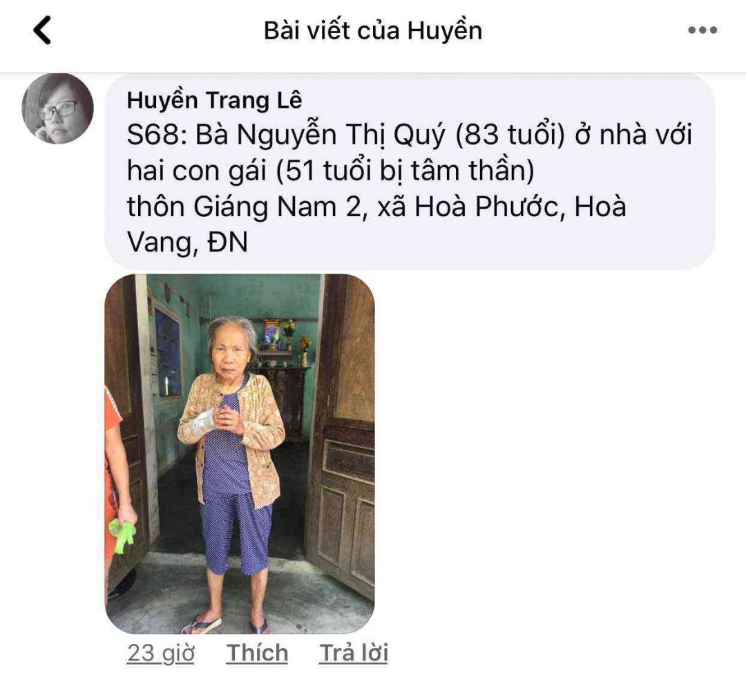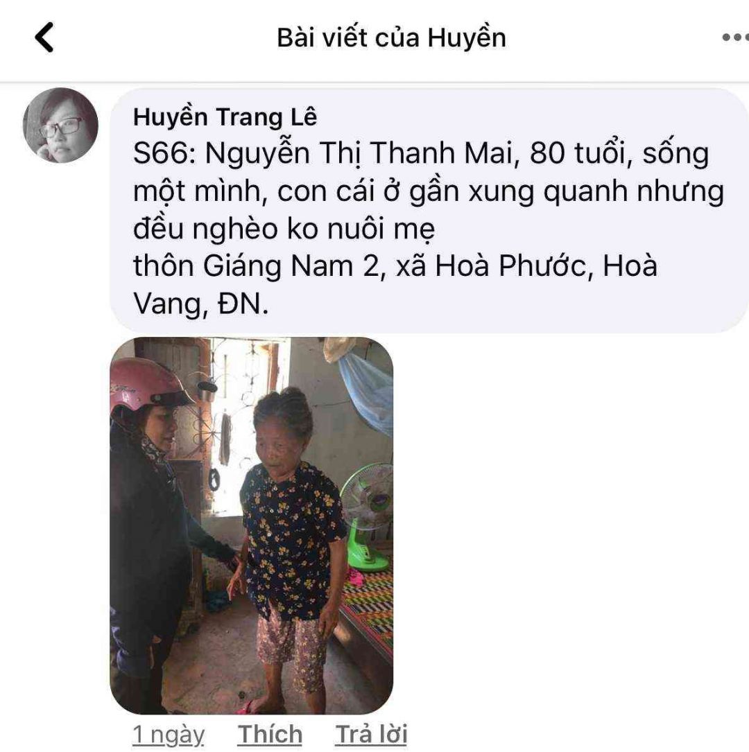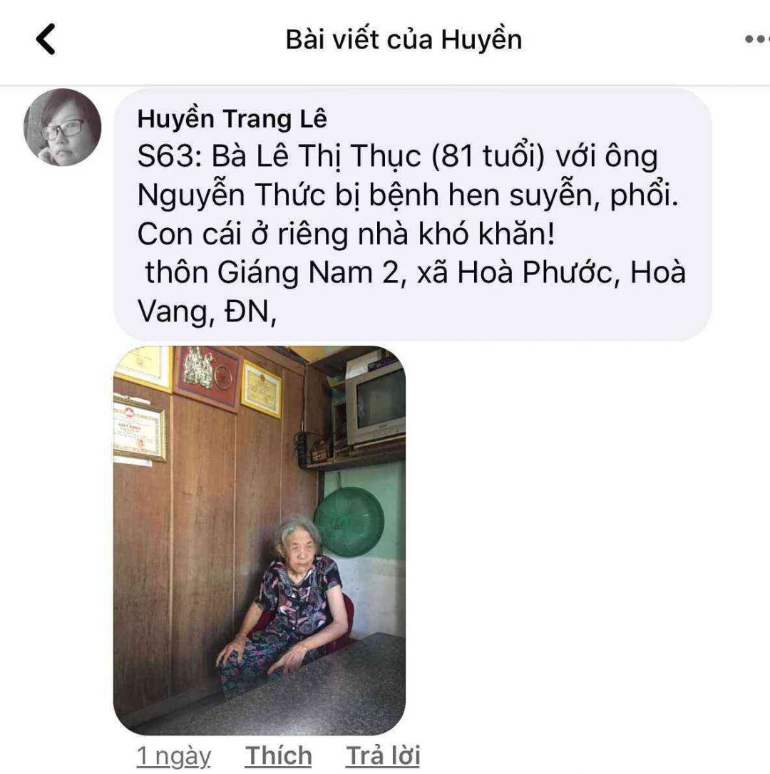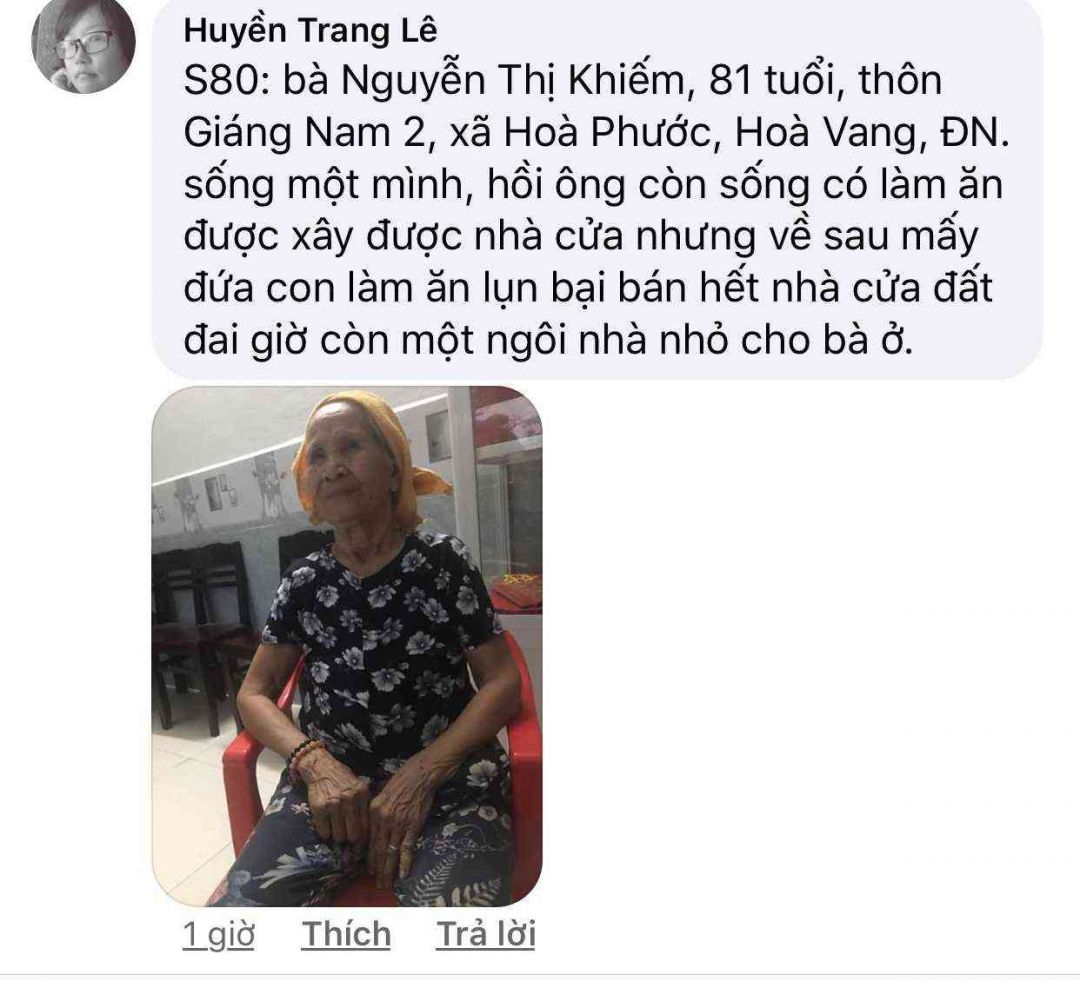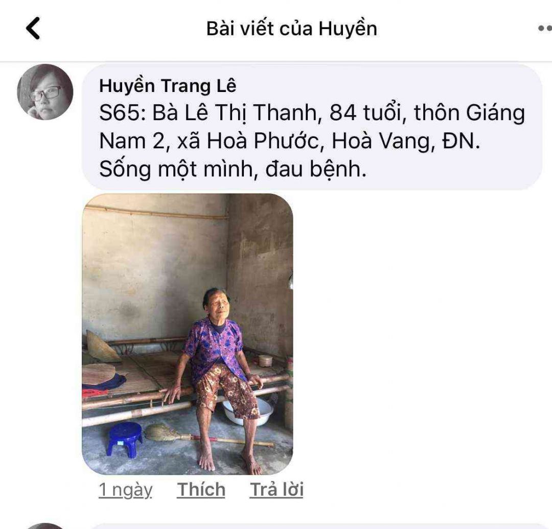 S65: Bà Lê Thị Thanh, 84 tuổi, thôn Giáng Nam 2, xã Hoà Phước, Hoà Vang, ĐN.