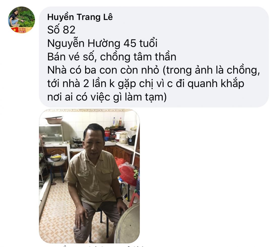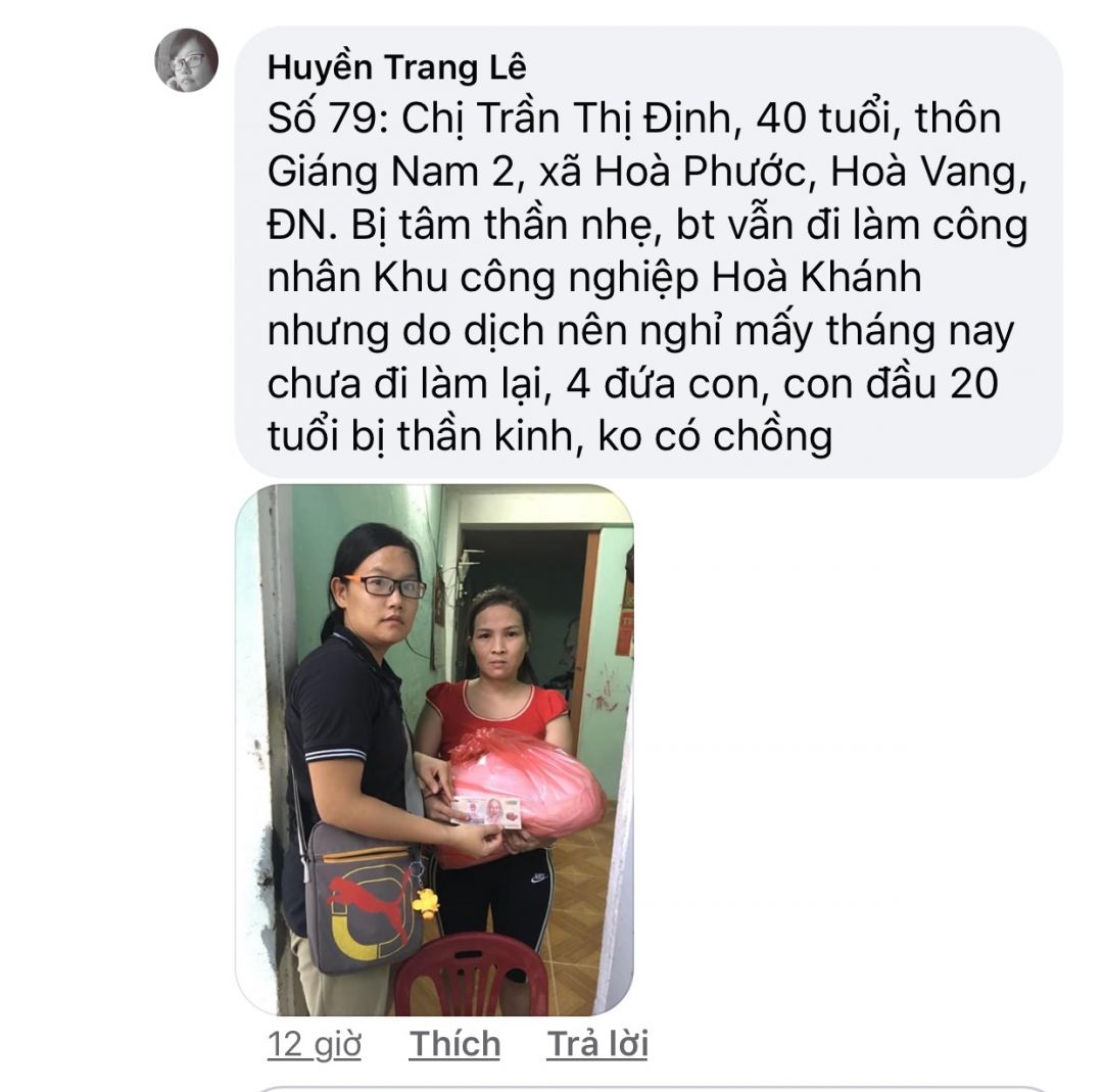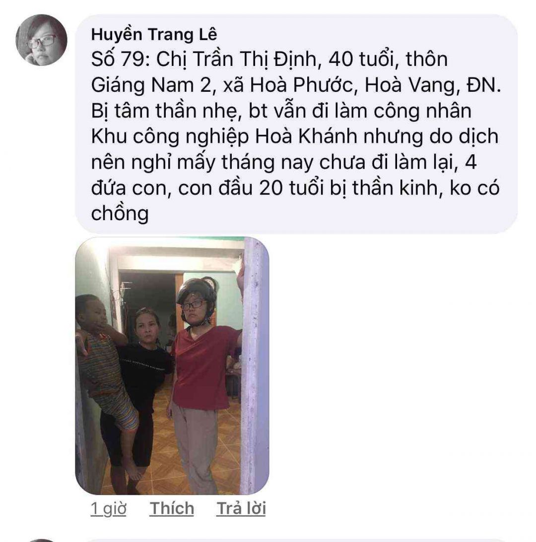 Số 79: Chị Trần Thị Định, 40 tuổi, thôn Giáng Nam 2, xã Hoà Phước, Hoà Vang, ĐN. Bị tâm thần nhẹ, bt vẫn đi làm công nhân Khu công nghiệp Hoà Khánh nhưng do dịch nên nghỉ mấy tháng nay chưa đi làm lại, 4 đứa con, con đầu 20 tuổi bị thần kinh, ko có chồng